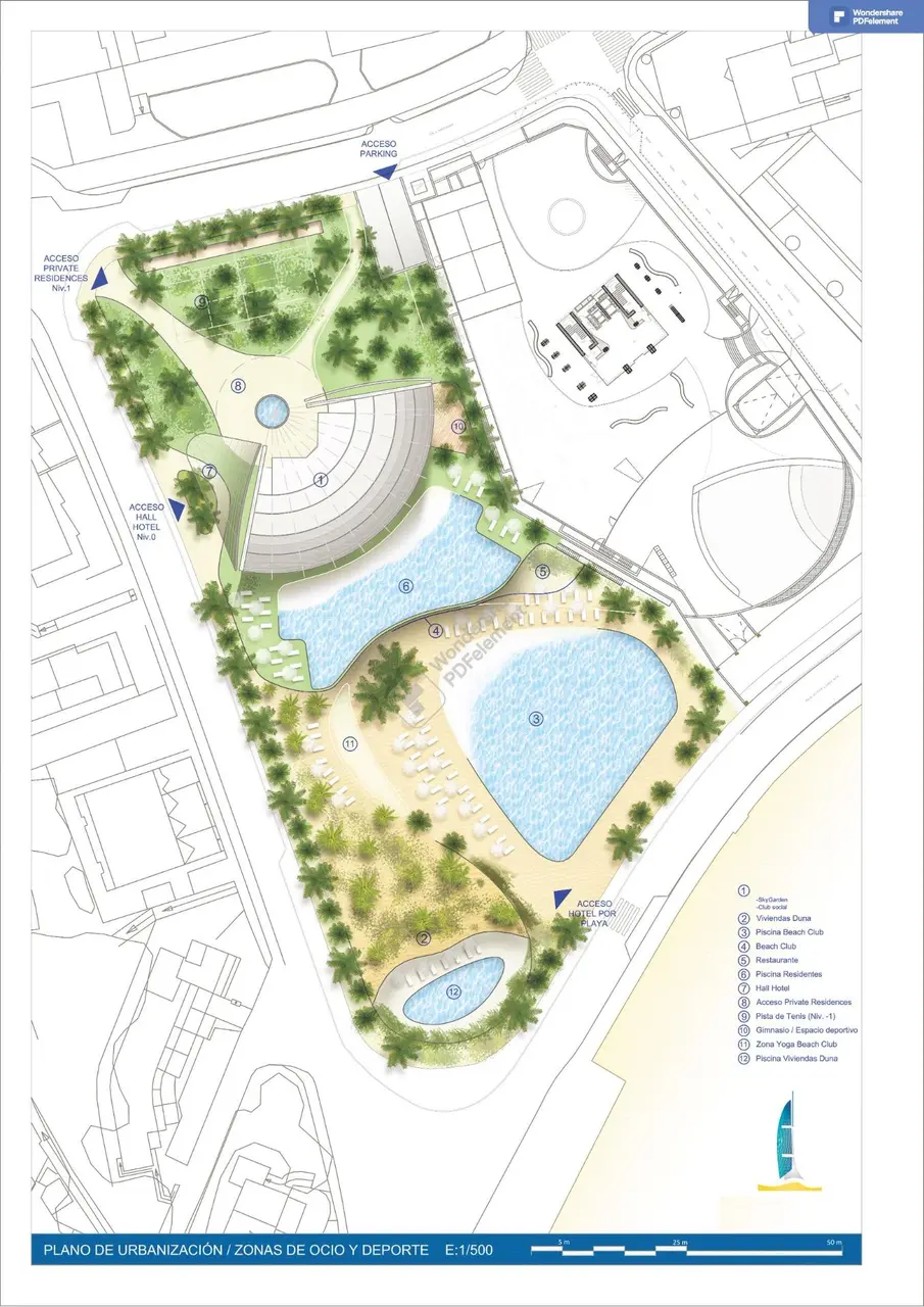 Projekt budynku będzie miał nową cechę krajobrazową: wokół budynku zostaną odtworzone wydmy zgodnie z inspiracją śródziemnomorską, która będzie dialogować z krajobrazem plaży Poniente. W otoczeniu idyllicznej enklawy, goście i mieszkańcy będą mogli korzystać ze słodkiej wody w 2 basenach (jeden o powierzchni 1000 m2 wyłącznie dla właścicieli; oraz drugi basen zewnętrzny, w klubie plażowym, o powierzchni około 1500 m2).