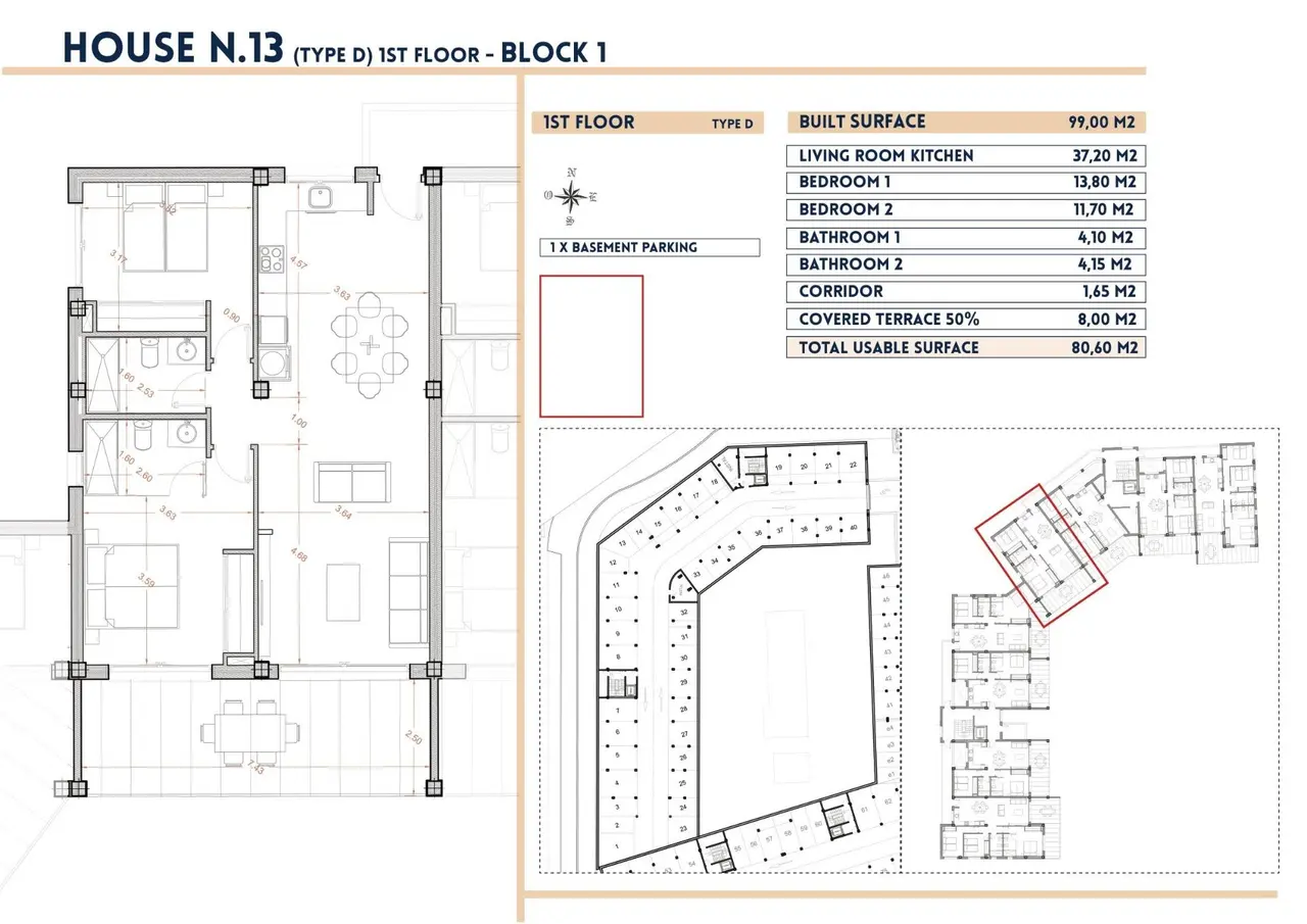 78 nowoczesnych i przestronnych apartamentów z 2 lub 3 sypialniami i 2 łazienkami, salonem z kuchnią na otwartym planie oraz podziemnym miejscem parkingowym.