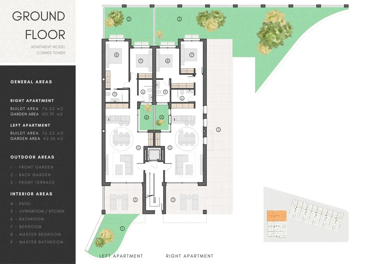 Apartamenty na parterze mają 2 sypialnie, 2 łazienki z prywatnymi ogrodami, a penthousy mają 3 sypialnie, 3 łazienki i taras, wszystkie z kuchnią na otwartym planie z częścią dzienną, wbudowanymi szafami, klimatyzacją, sprzętem AGD, miejscem parkingowym i komórką lokatorską.