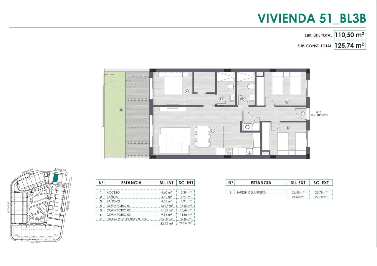 Wszystkie apartamenty posiadają w pełni wyposażoną kuchnię z płytą witroceramiczną, wentylatorem wyciągowym i piekarnikiem, ciepłą wodę dzięki ogrzewaniu aerotermalnemu, gładką białą farbę na ścianach i suficie, drzwi i okna z PCV z podwójnymi szybami. Posiadają również klimatyzację/ogrzewanie i kompletne szafy we wszystkich sypialniach.