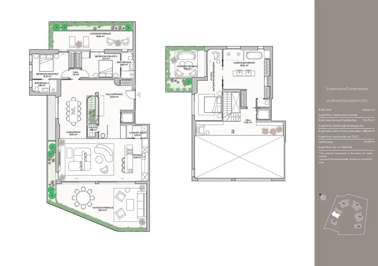 Oszałamiające i przestronne apartamenty z bujnymi i rozległymi prywatnymi ogrodami o powierzchni 155 m2, na środkowych piętrach znajdują się przestronne tarasy o powierzchni od 40 m2, które maksymalizują wykorzystanie światła i płynnie wtapiają się w krajobraz oraz imponujące dwupoziomowe penthouse’y z 3 sypialniami, o powierzchni od 270 m2, z dwupoziomowymi salonami i prywatnymi tarasami z tarasem słonecznym.