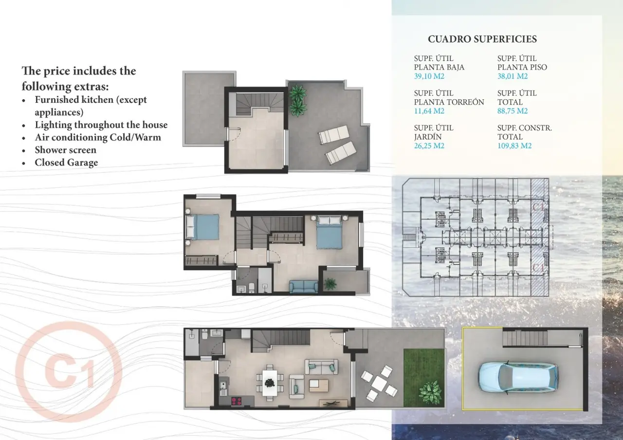 Morze Śródziemne. Bezkonkurencyjny ze względu na swoją sytuację, zaledwie 800 metrów od portu Tomás Maestre, gdzie znajdziemy wybraną strefę rekreacyjną z barami, kawiarniami, restauracjami, sklepami, supermarketami, aptekami, bankami itp. Ten projekt ma 28 wspaniałych dupleksów z 2 i 3 sypialnie. W Residencial domy zostały zaprojektowane tak, aby wykorzystać każdy zakamarek domu