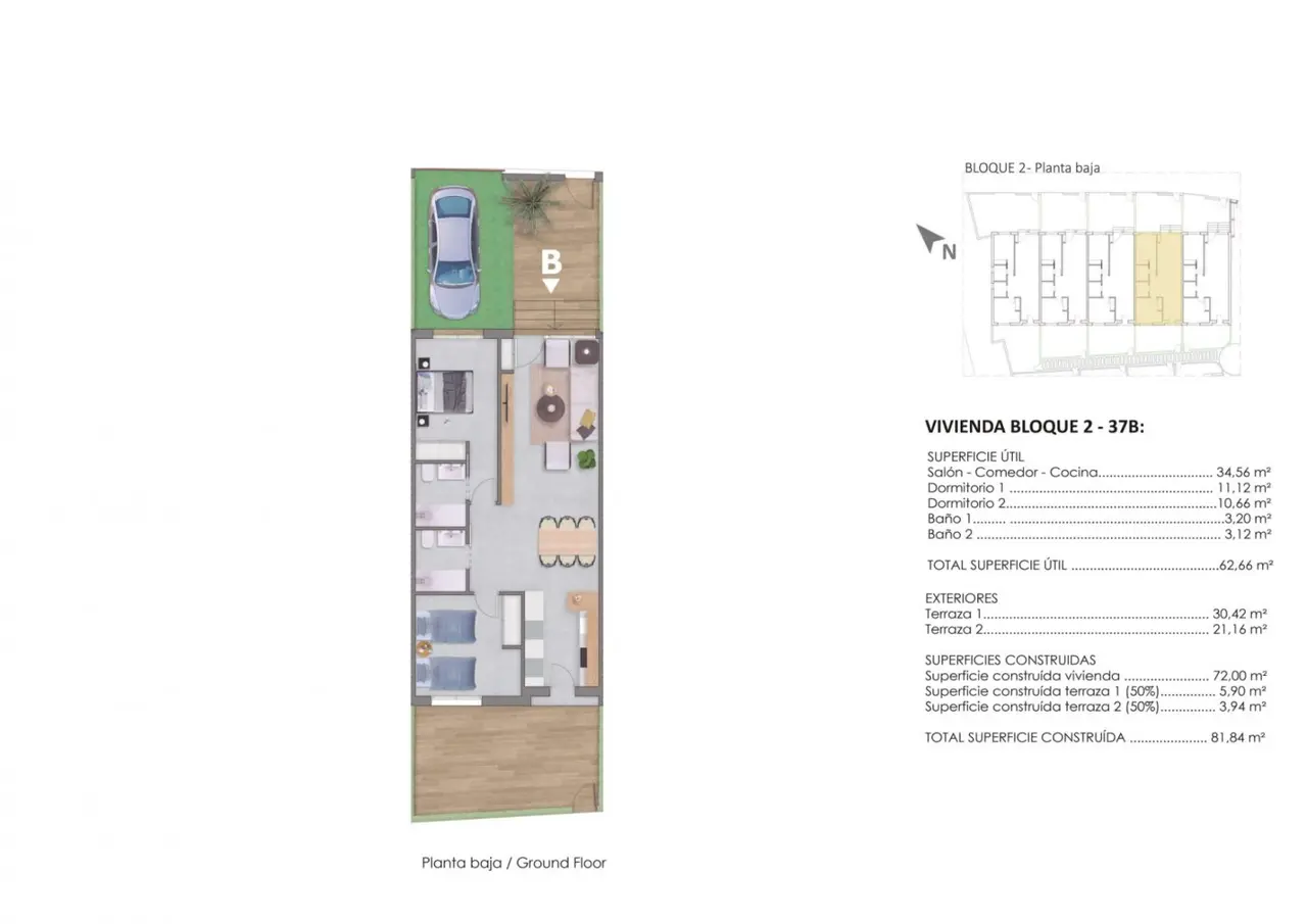 Nowy budynek mieszkalny z 28 bungalowów z 2 sypialniami, 2 łazienki na parterze z prywatnym ogrodem i 2 i 3 sypialnie i 2 i 3 łazienki na najwyższym piętrze z prywatnym solarium.