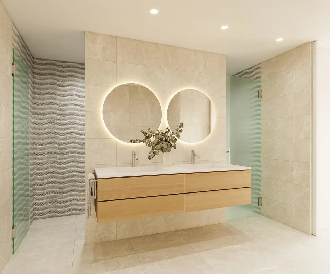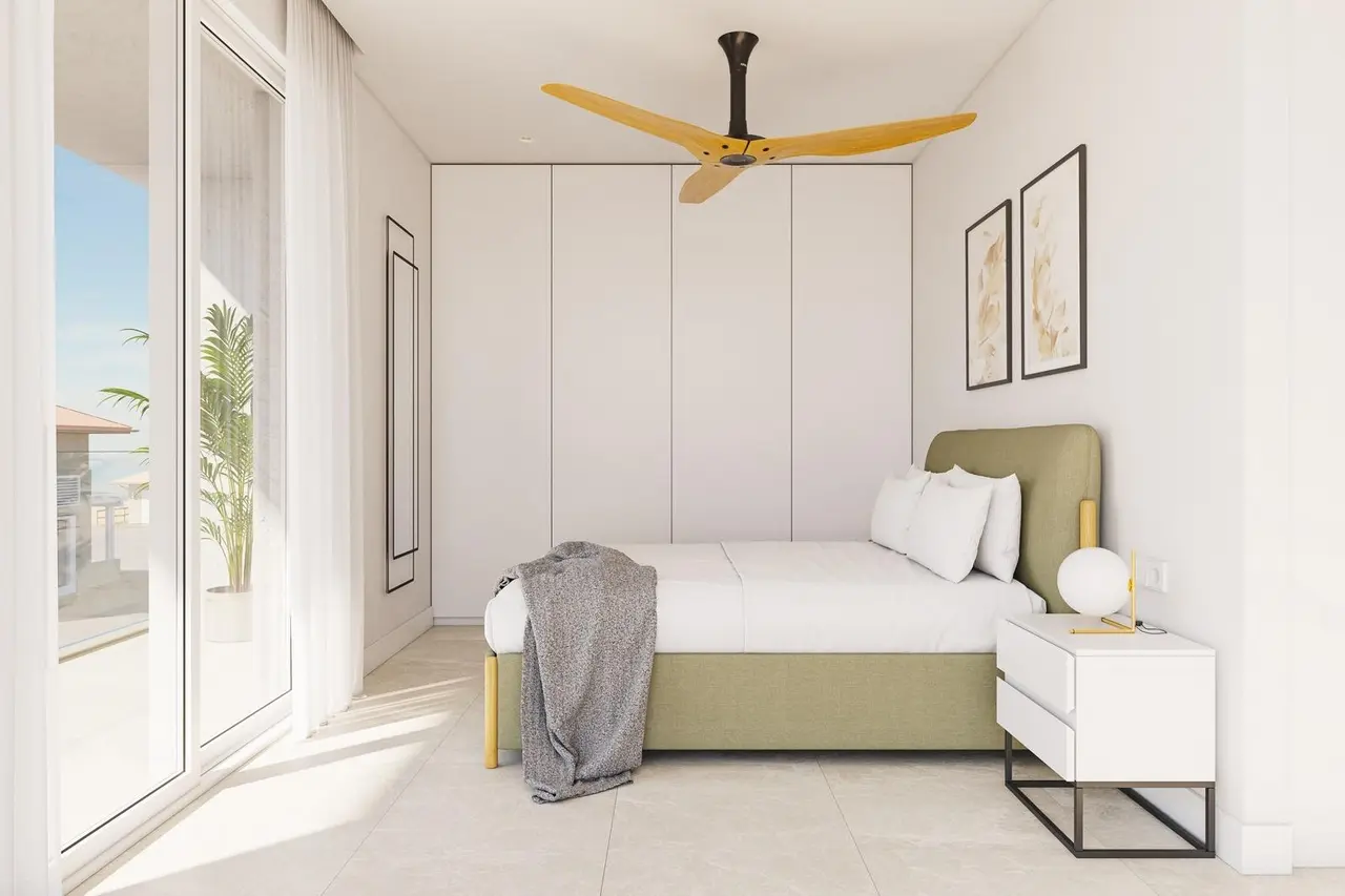 Ten wielofunkcyjny podest ustępuje miejsca dwóm przestronnym sypialniom, z których jedna ma prywatny taras, a obie dzielą elegancką łazienkę o powierzchni 10 m2.
