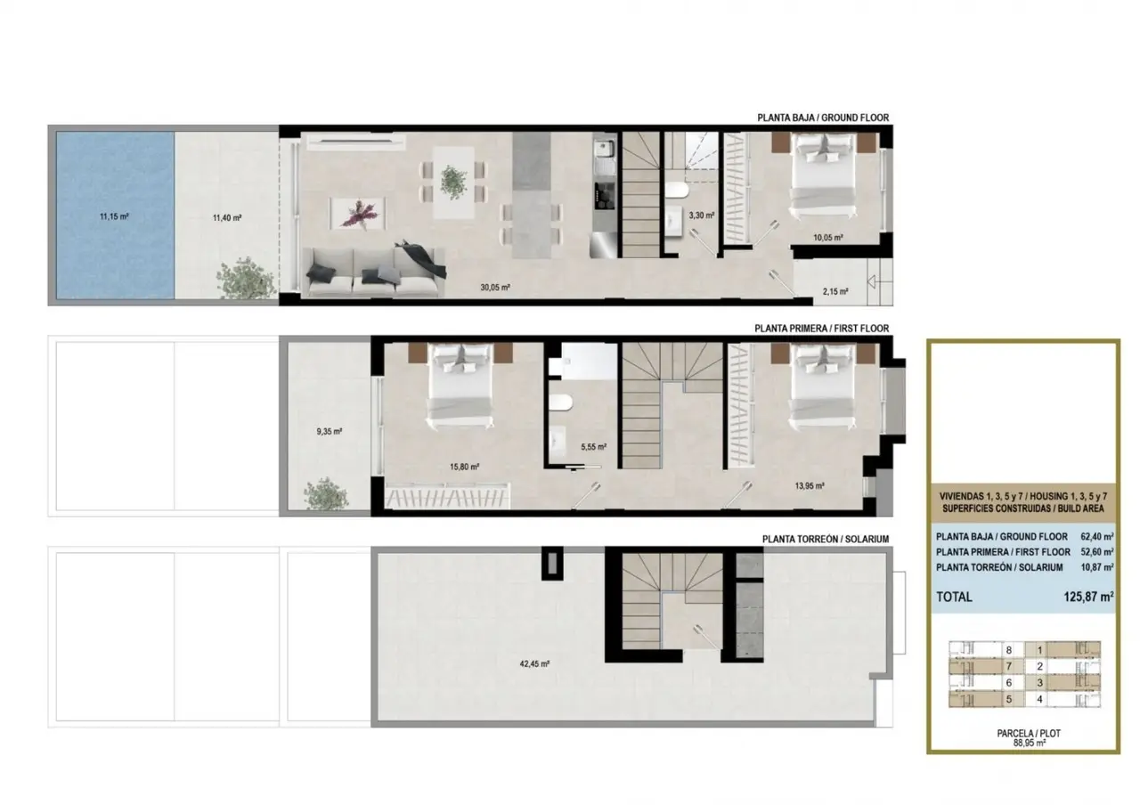 Każda nieruchomość posiada 3 sypialnie i 2 łazienki i została zaprojektowana we współczesnym stylu i otwartej koncepcji, składającej się z w pełni wyposażonej kuchni i salonu-jadalni.