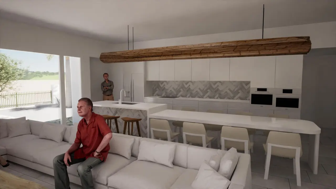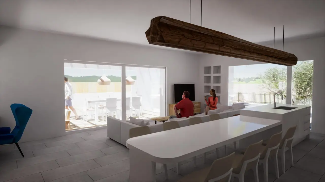 Dom ma oszałamiającą prezencję, a salon ma wyższy dach niż zwykle, tworząc ogromny salon z otwartą kuchnią i wyspą kuchenno-jadalną (stół jadalny połączony z wyspą kuchenną).