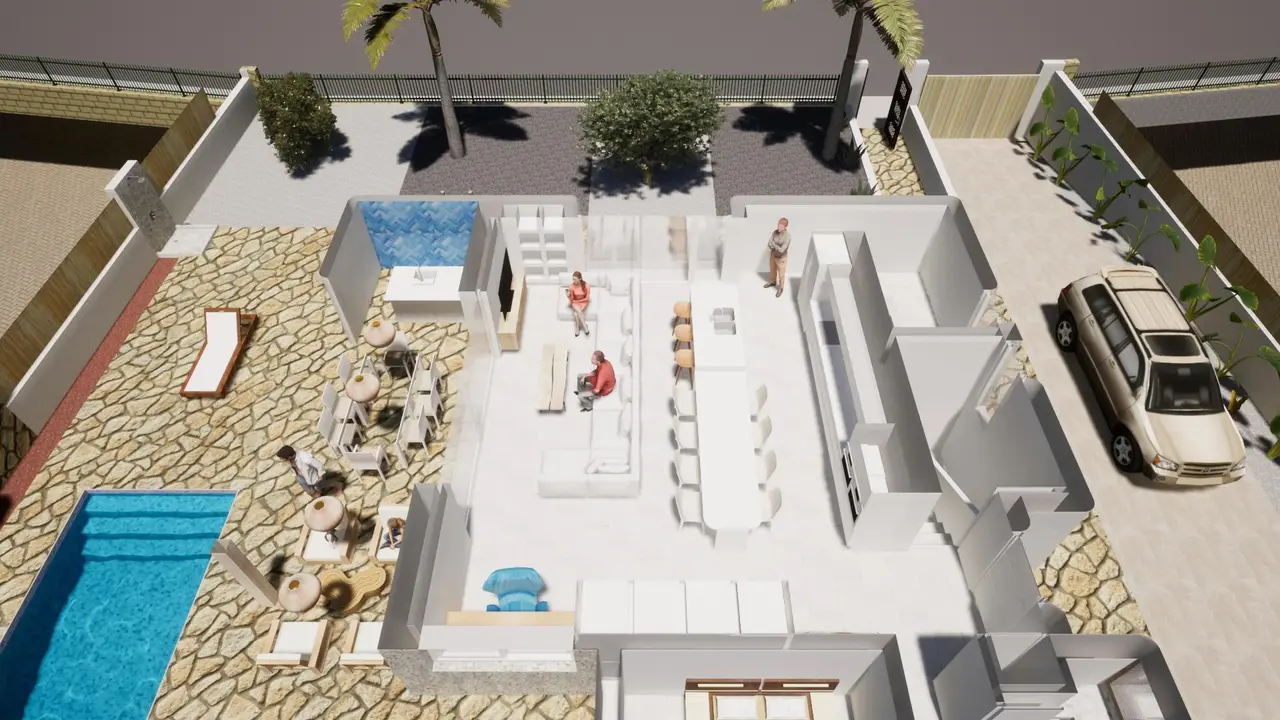 Istnieją duże przesuwne okna, które po otwarciu są ukryte w zagłębieniach ścian, zapewniając ciągłe wrażenia w kierunku zewnętrznego basenu, gdzie znajduje się zadaszony obszar (betonowy dach i ściany murowane), który tworzy najbardziej przyjemną przestrzeń na zewnątrz.