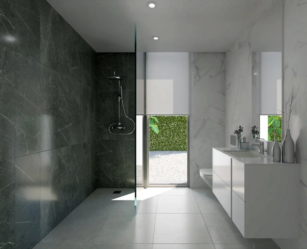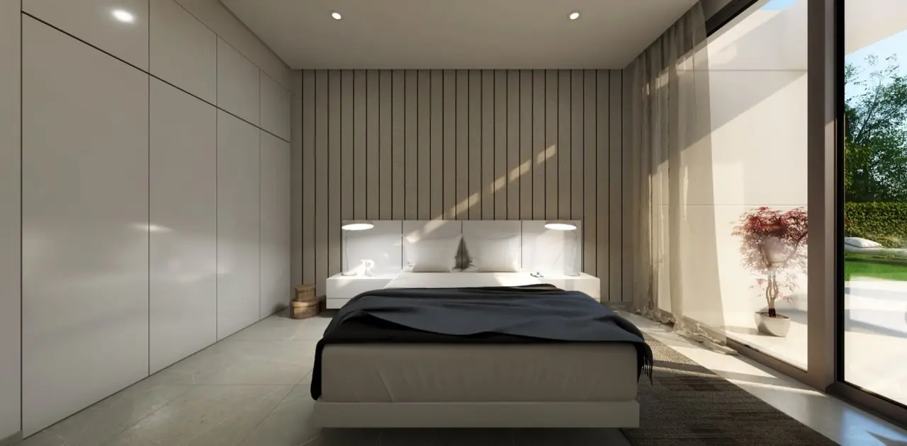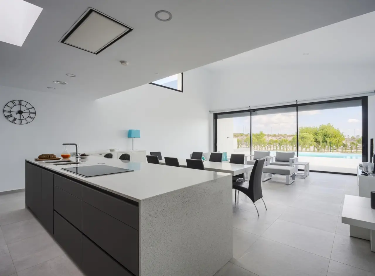 4 sypialnie, 4 łazienki, kuchnia na otwartym planie z jasnym salonem z dużymi oknami i bezpośrednim dostępem do basenu i ogrodu, solarium i garaż.
