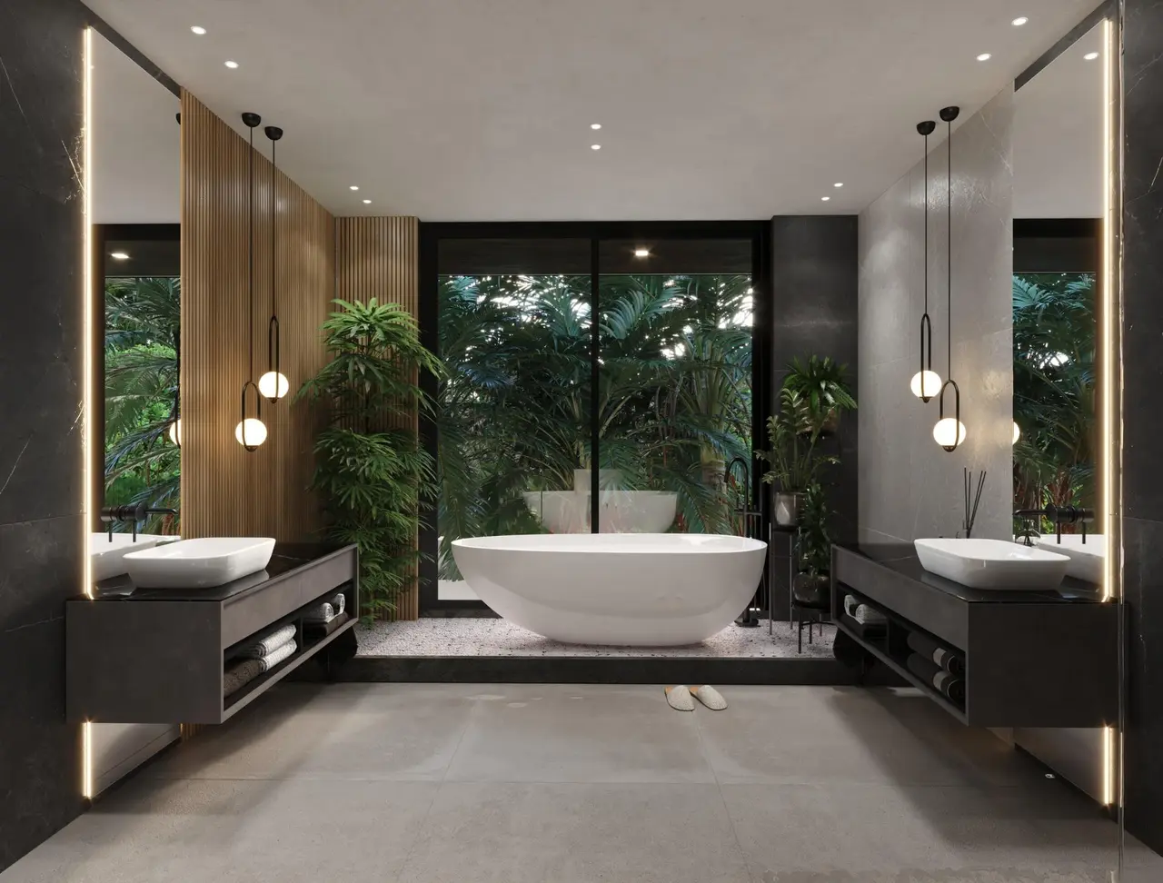 Na parterze znajduje się przestronna kuchnia na otwartym planie i część dzienna, która wychodzi na rozległe tarasy i strefę relaksu przy basenie.