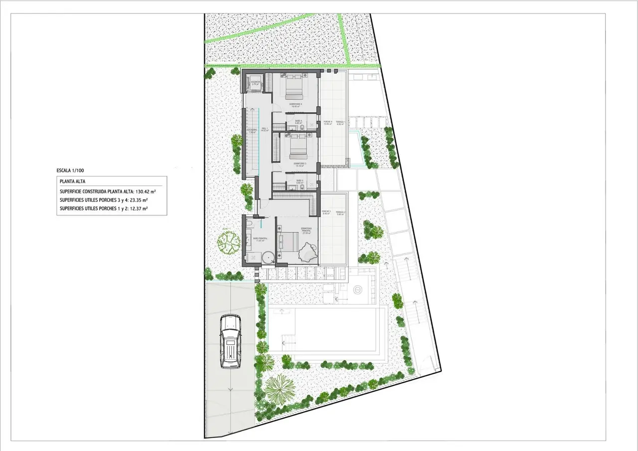 Na piętrze znajduje się główny apartament z prywatnym tarasem i trzy dodatkowe sypialnie, każda z łazienką, oferujące mnóstwo miejsca na relaks.