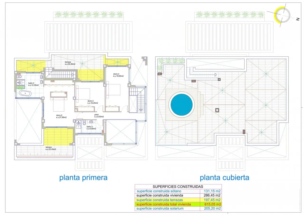 Posiada 4 sypialnie i 4 łazienki, solarium z 197m2, piwnica z 205m2.
