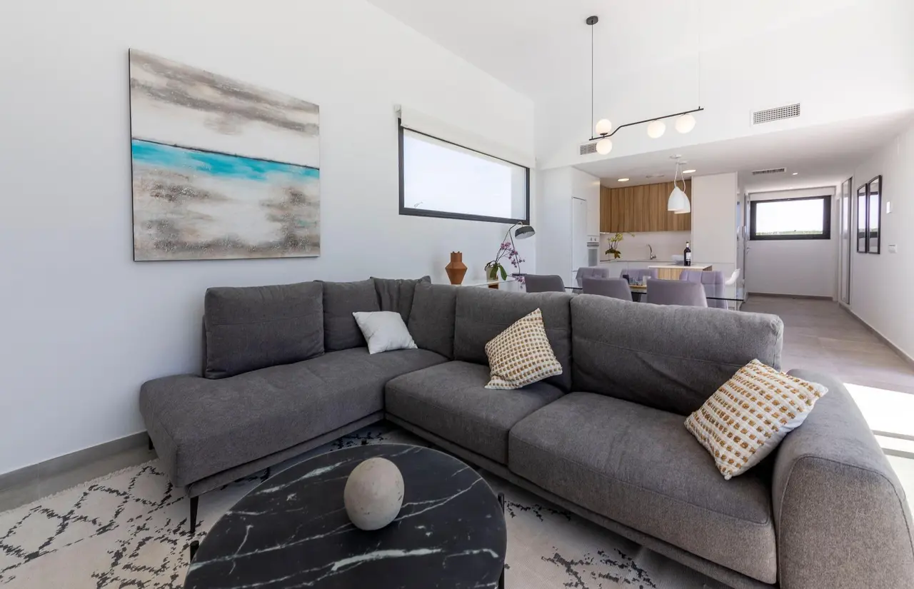 Okna aluminiowe w kolorze czarnym matowym, żaluzje z napędem, drzwi wejściowe opancerzone, drzwi wewnętrzne lakierowane na biało, system aerotermiczny do produkcji ciepłej wody, blat z kwarcu (silestone) w kuchni, urządzenia elektryczne w komplecie, wstępna instalacja klimatyzacji kanałami.