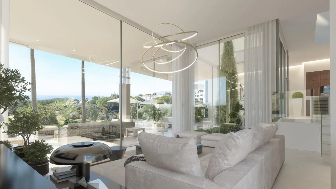 Główny poziom na otwartym planie podzielony wewnętrznym ogrodem na dwie części: salon z kominem i nowoczesną kuchnią z urządzeniami Siemens prowadzącymi do jadalni i pięknej przestrzeni zewnętrznej. 3 do 4 sypialni na 1 piętrze, każda z łazienką i tarasem. Konfigurowalna piwnica, solarium z niesamowitym widokiem na pole golfowe i morze.