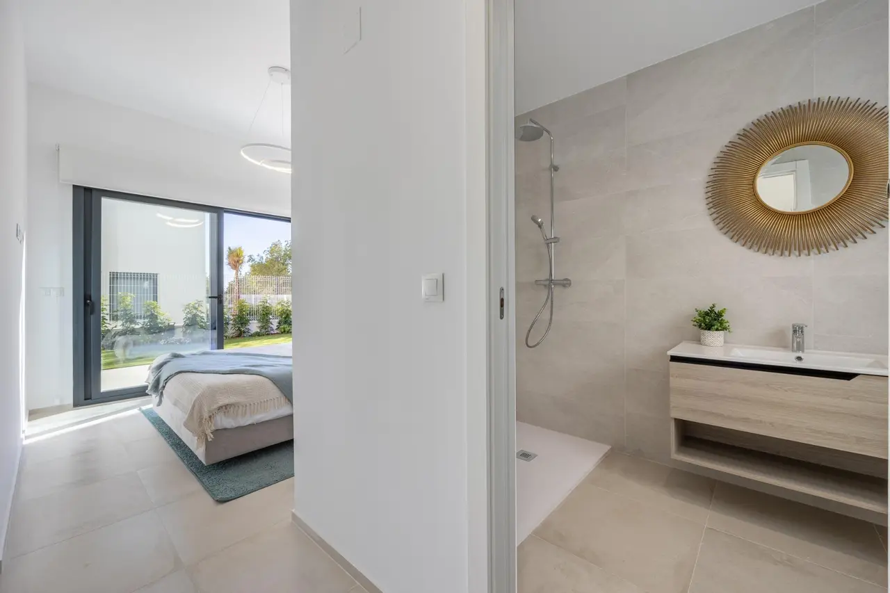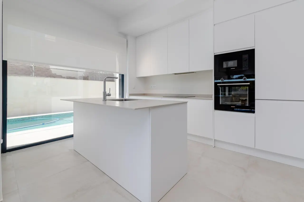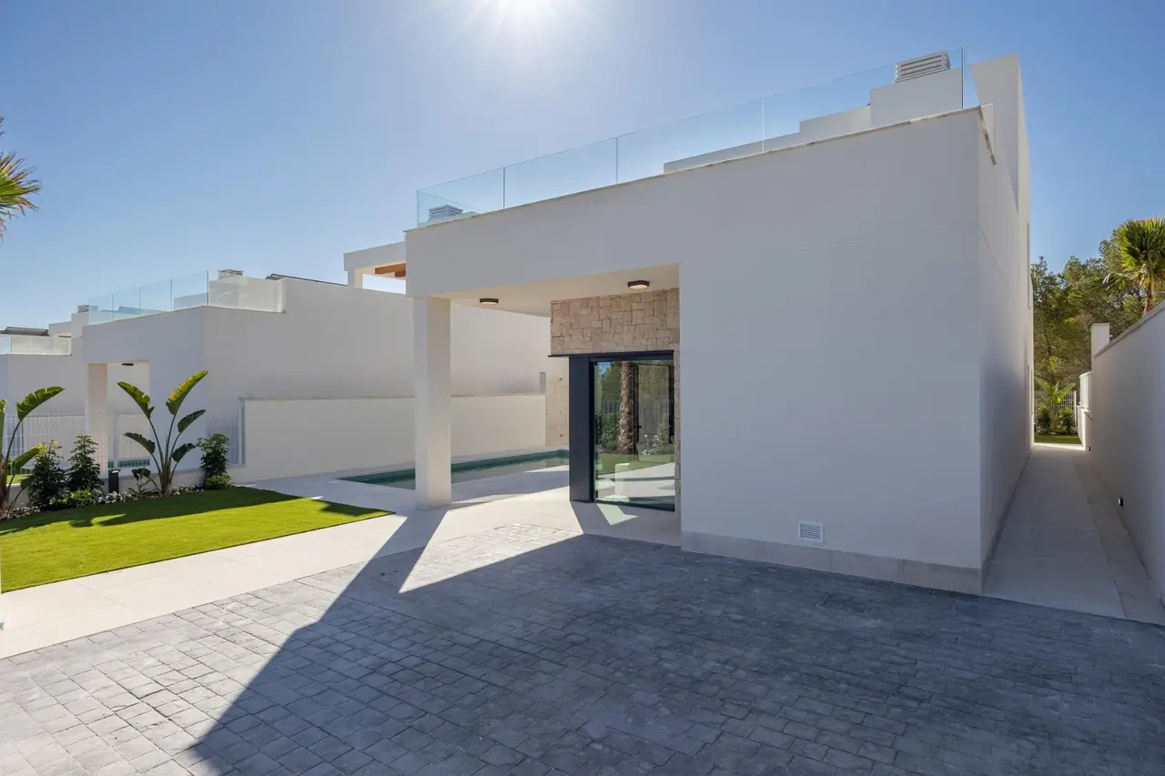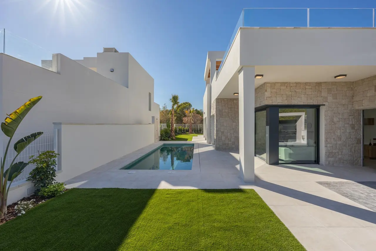 Wille zbudowane na 2 piętrach, posiada 3 sypialnie, 2 łazienki, kuchnia na otwartym planie z salonem, wbudowane szafy, taras i solarium, prywatny ogród z basenem i 2 miejsca parkingowe.