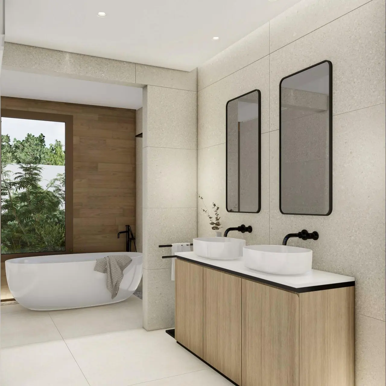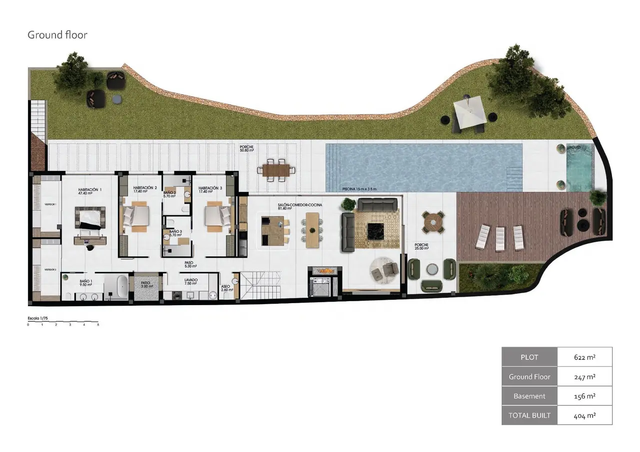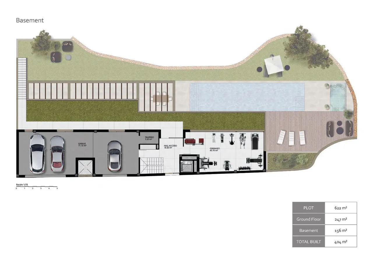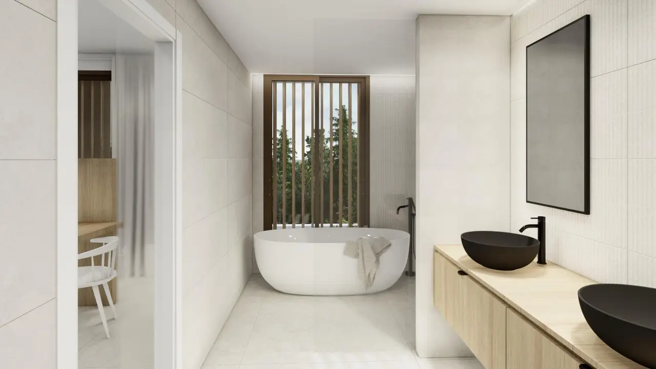 Wszystkie wille mają 3 sypialnie, 3 łazienki, toaletę dla gości, kuchnię na otwartym planie z salonem, wbudowane szafy, piwnicę z podwójnym garażem, prywatny ogród z basenem i widokiem na morze.