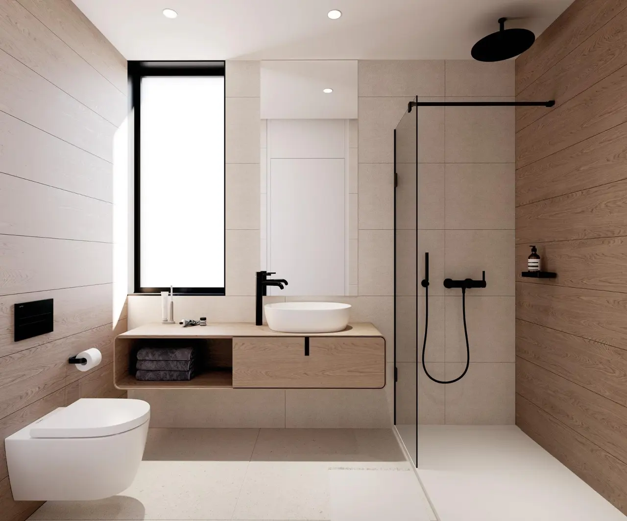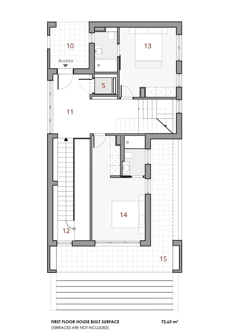 Wreszcie poziom 2, na którym znajduje się główna sypialnia, otwiera się na przestronny taras i jest wykończony teksturowaną jednowarstwową okładziną w ciepłym odcieniu.