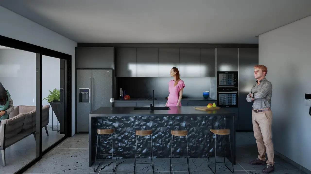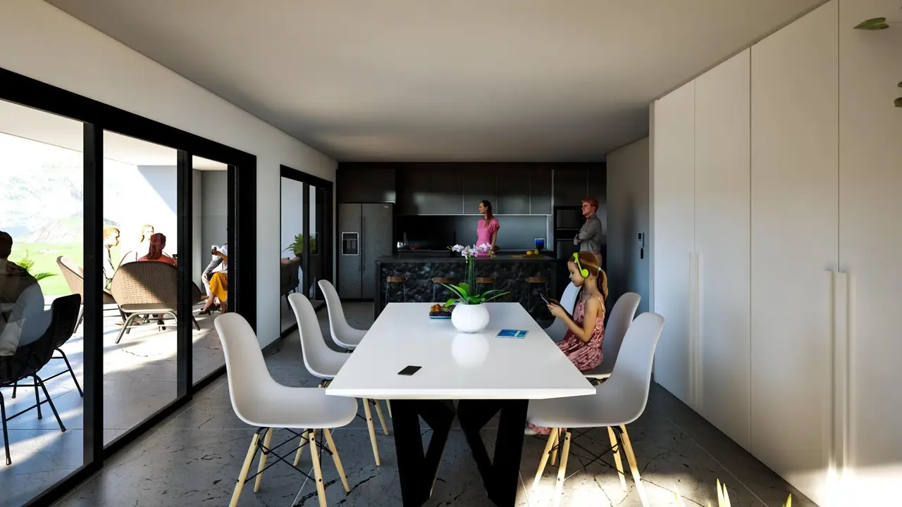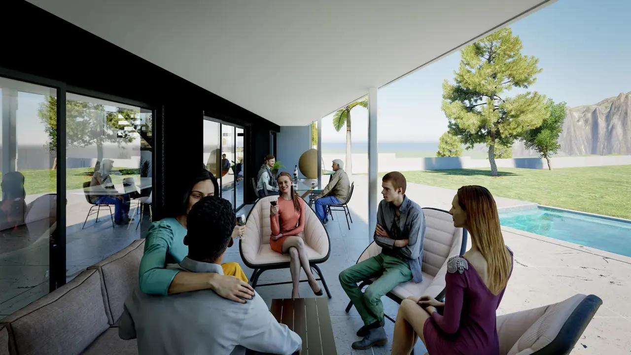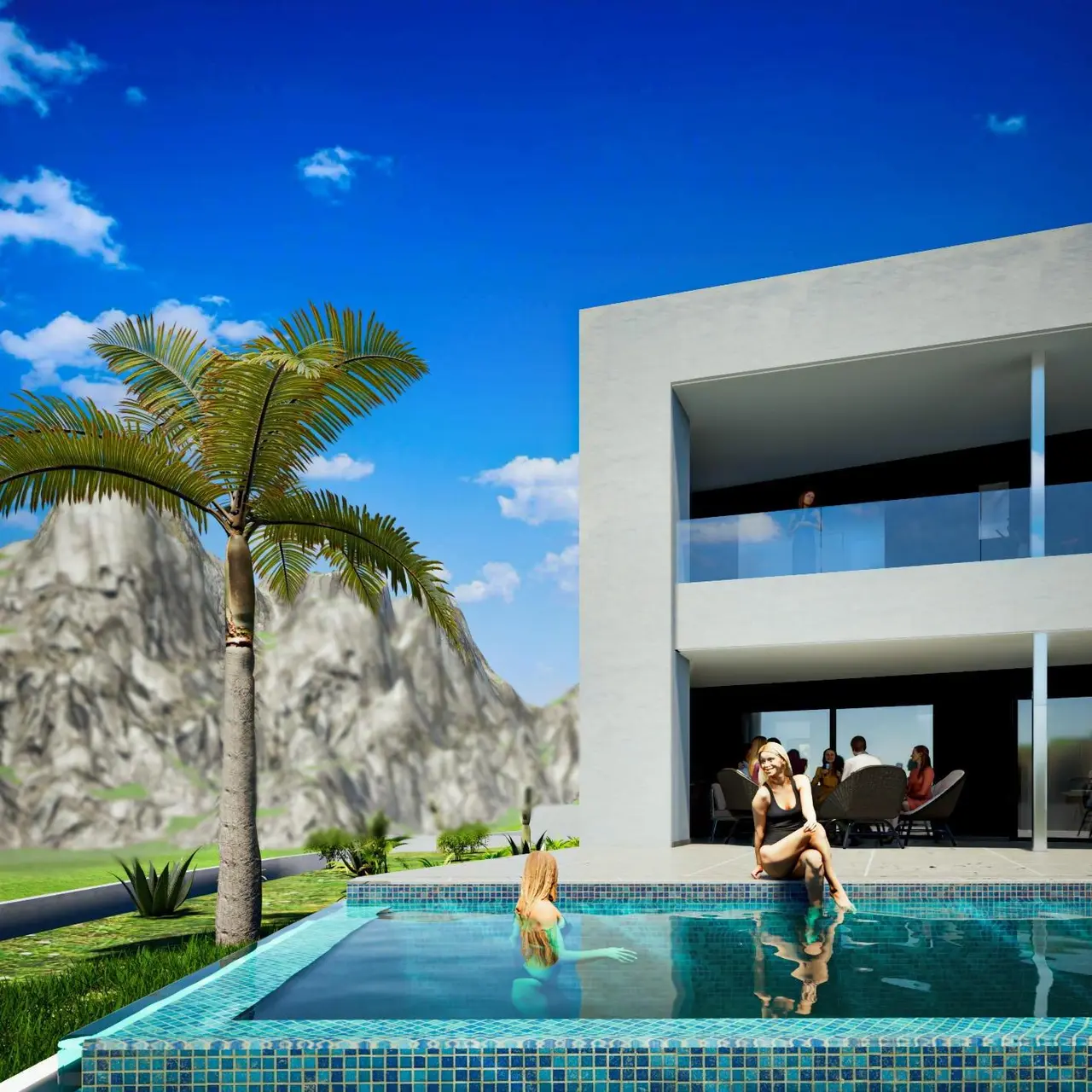 Salon rozszerza się w kierunku zewnętrznego tarasu i basenu, z dużym zadaszonym tarasem, który pozwala na maksymalny komfort na świeżym powietrzu. Możliwość posiadania basenu bez krawędzi, a także kolorowego oświetlenia LED.