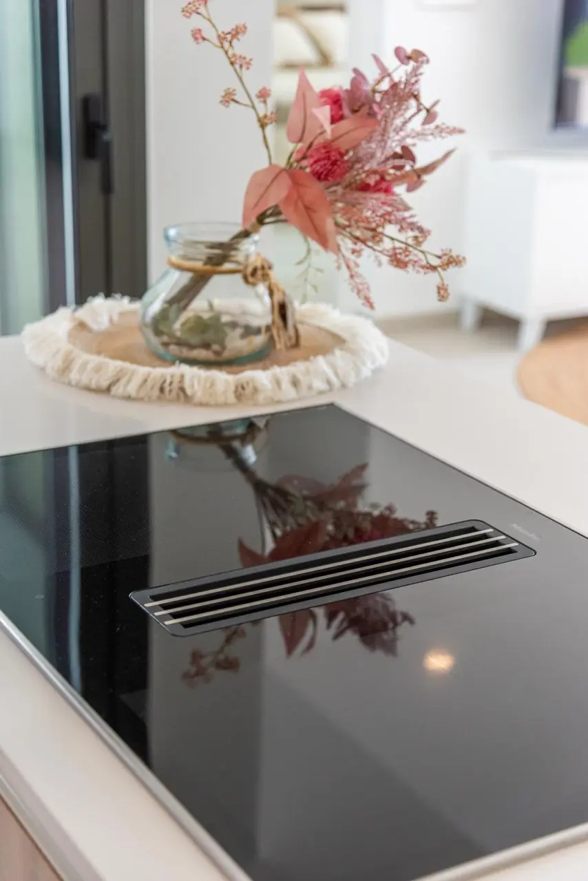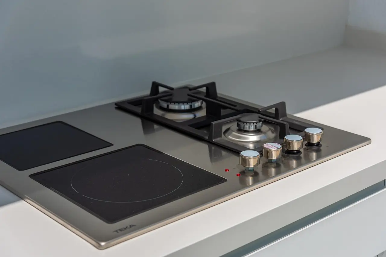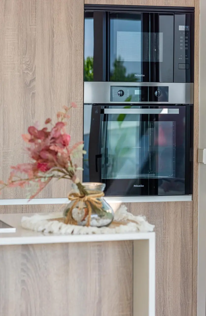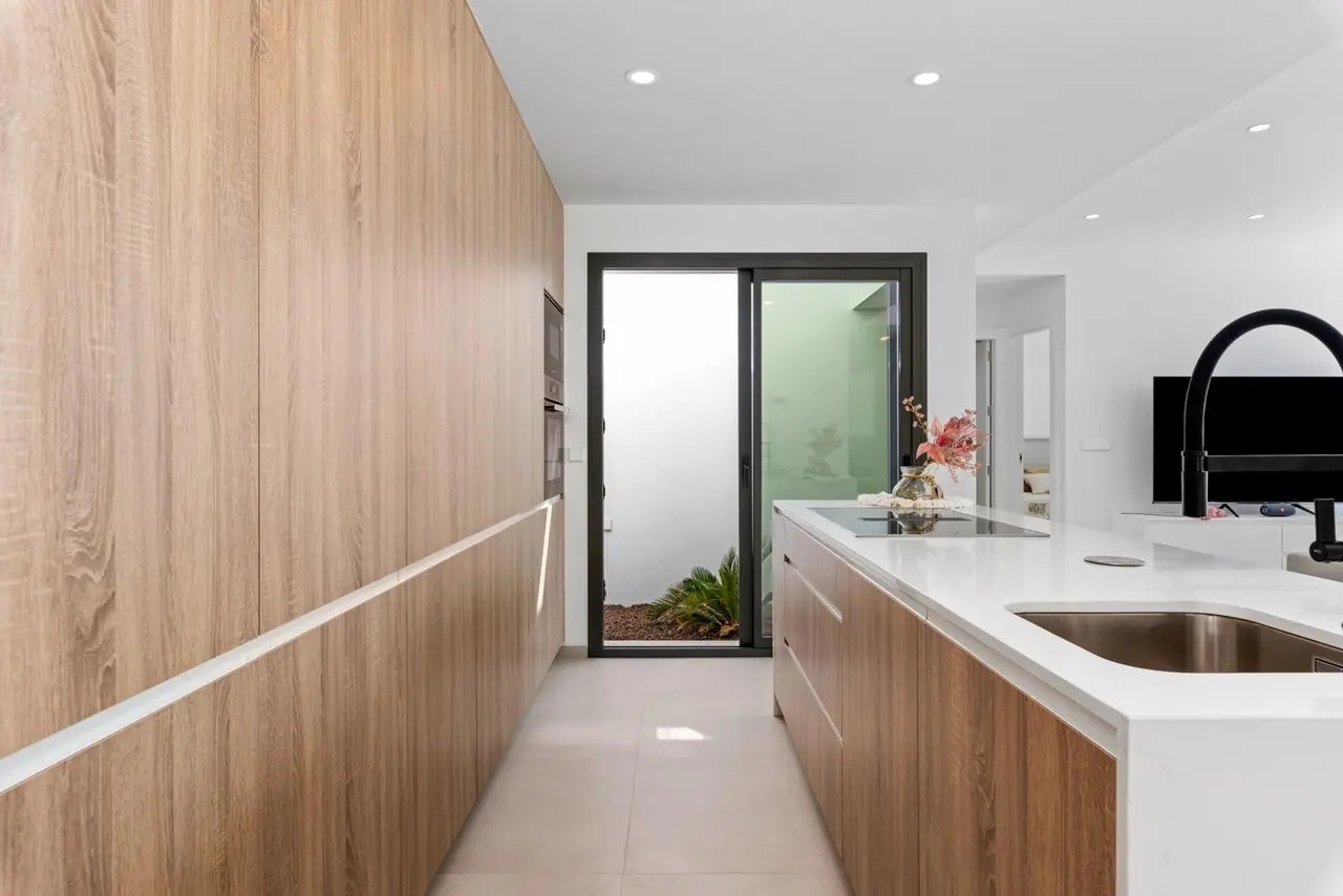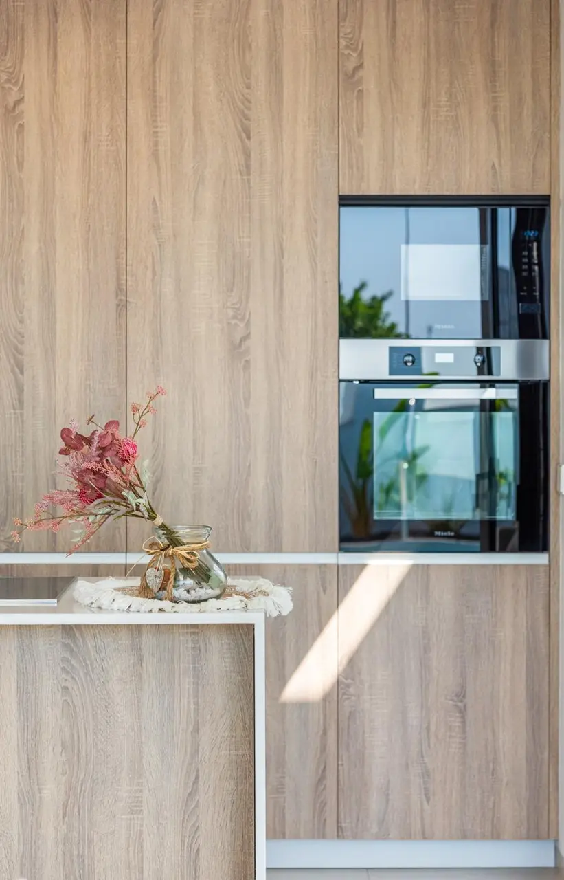 W pełni wyposażona kuchnia w białym połysku lub w kolorze drewna. Technologiczny kwarc. Zlewozmywak ze stali nierdzewnej. Płyta indukcyjna ze zintegrowanym wyciągiem, piekarnik, kuchenka mikrofalowa, pralka, zintegrowana lodówka, zintegrowana zmywarka.