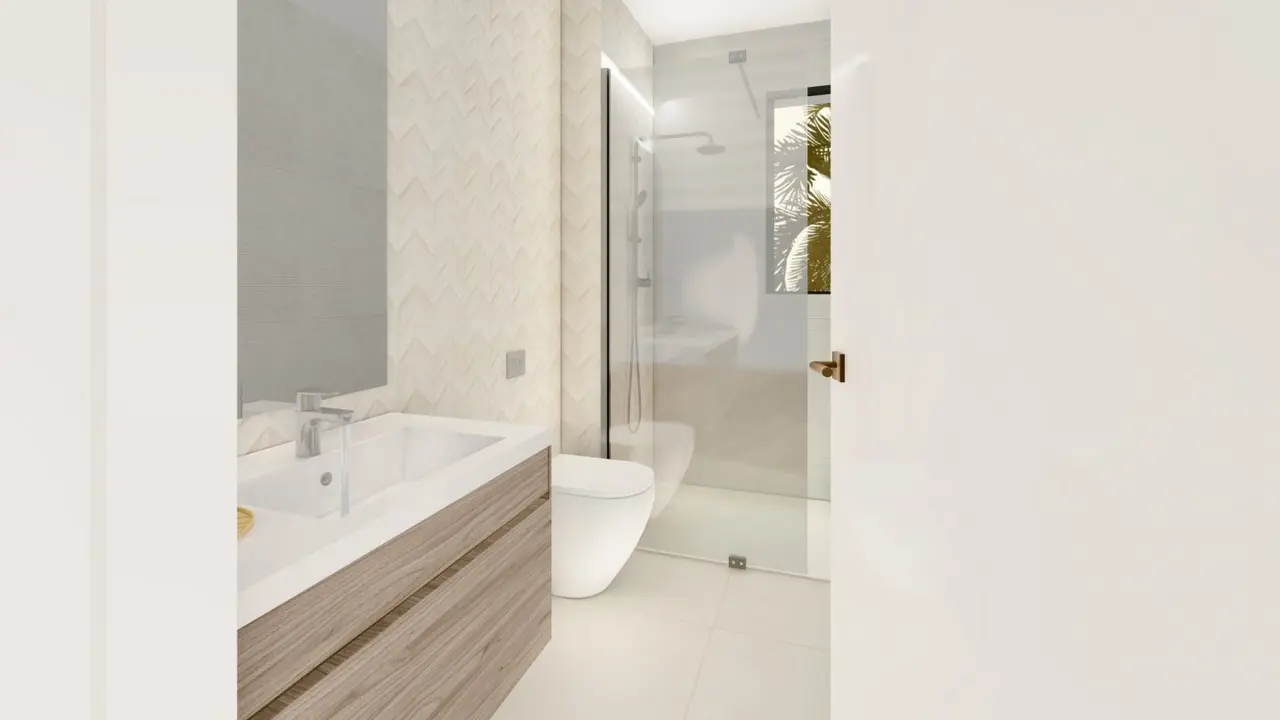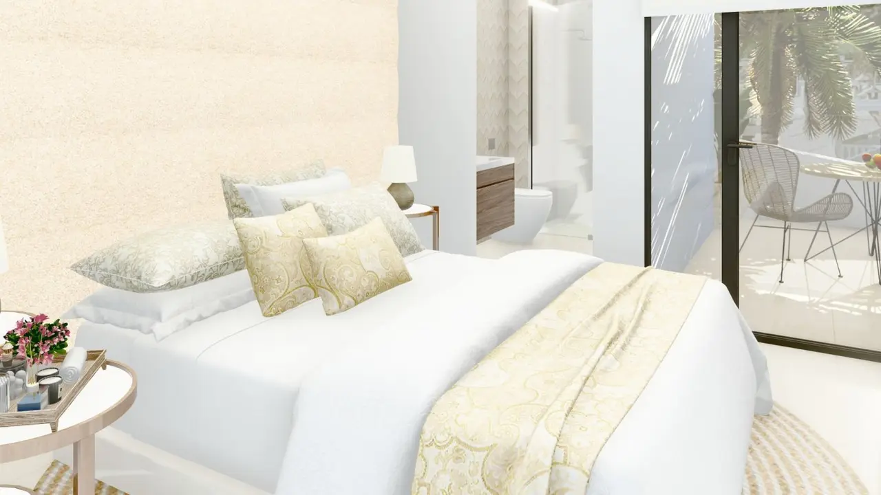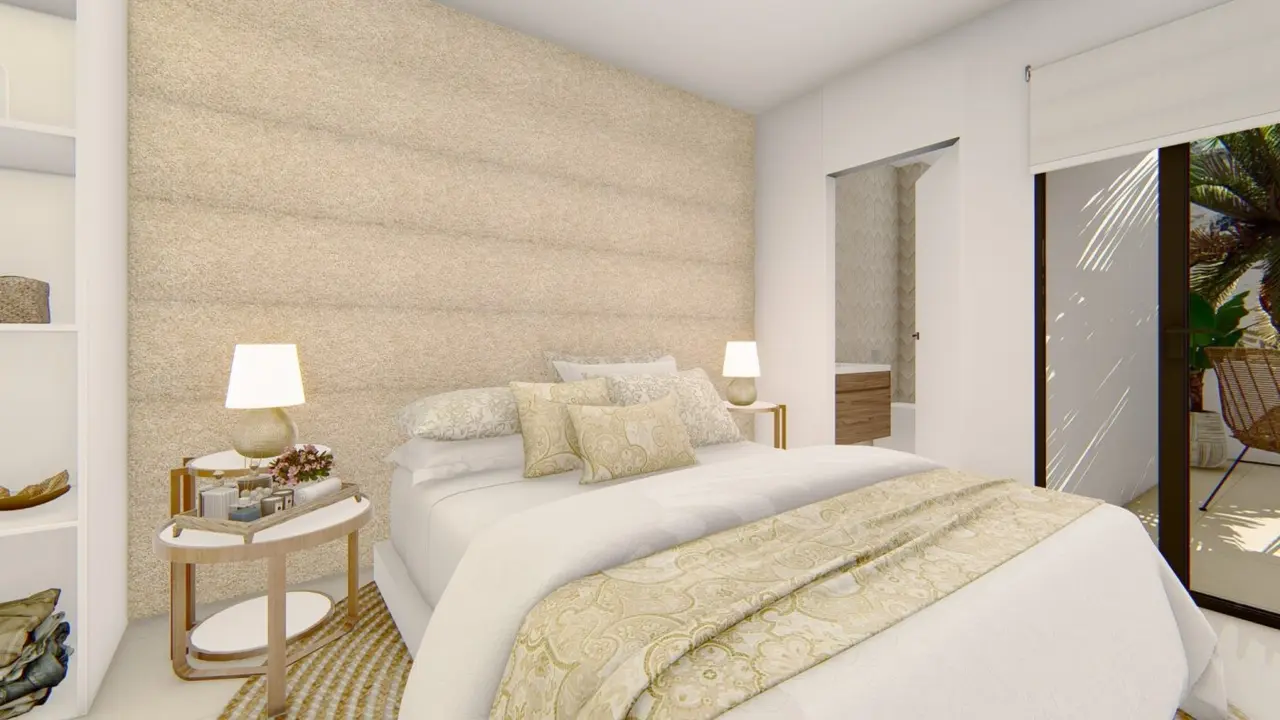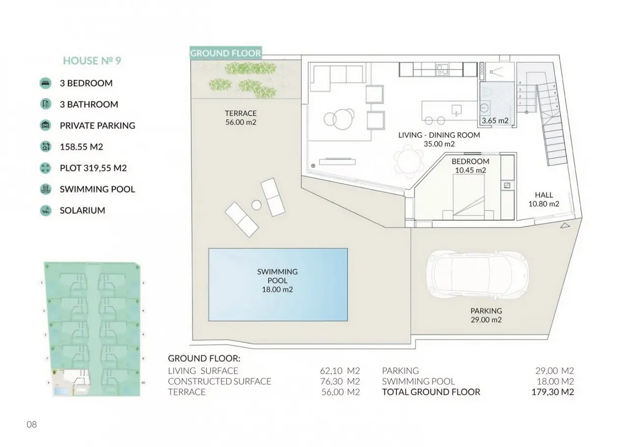 Dostępne są 3 sypialnie (2 z łazienkami), 3 łazienki, salon, kuchnia otwarta na salon z dużymi oknami i wyjściem na duży częściowo zadaszony taras oraz prywatny ogród z basenem i miejscem parkingowym.