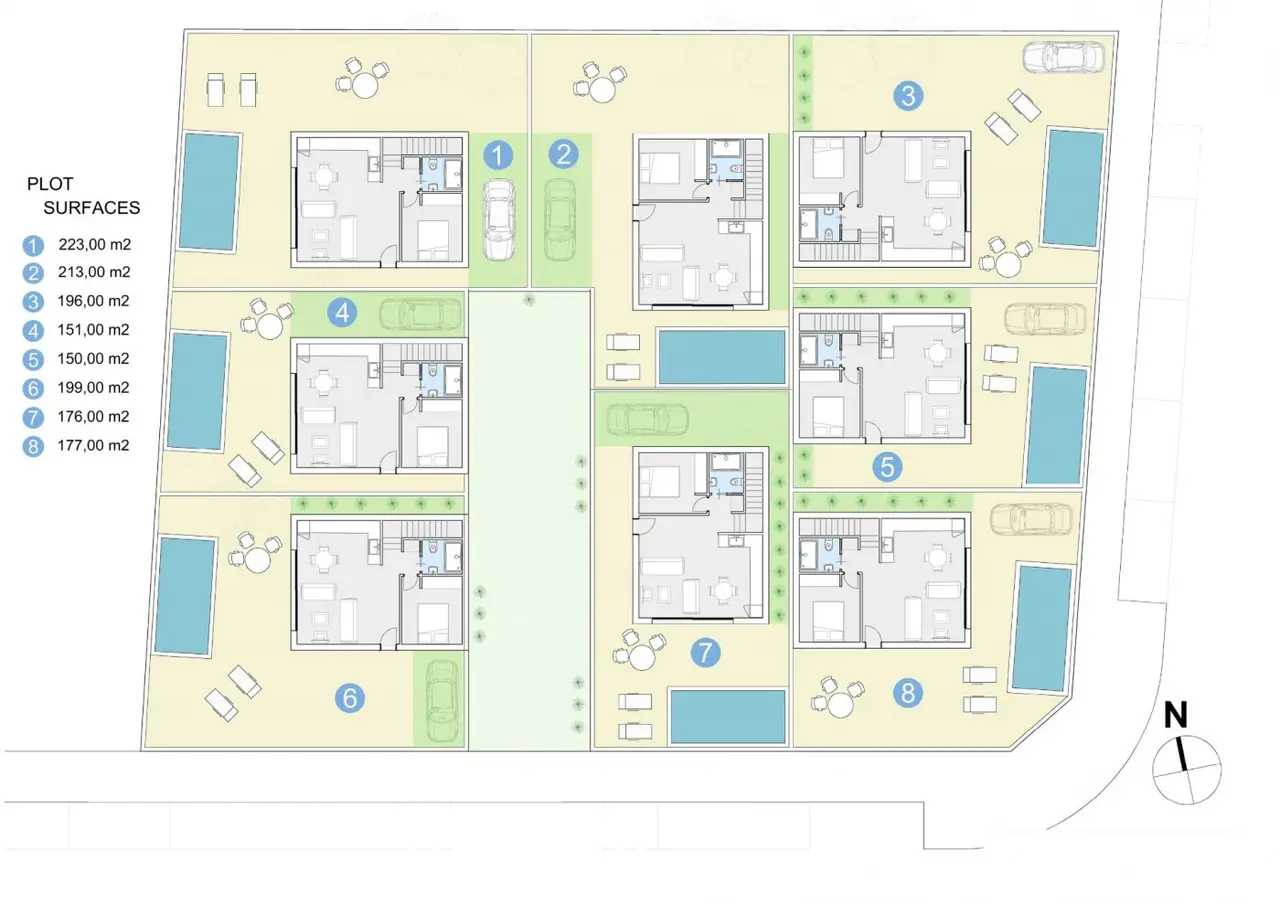 Piękne wille z 3 sypialnie i 2 łazienki, pokój dzienny, kuchnia, galeria i taras zbudować na działkach od 150m2 do 223m2, posiada ogród z prywatnym basenem i parkinf miejsca.