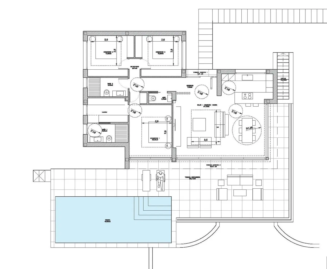 Nowo wybudowana willa ma 3 sypialnie, 3 łazienki, kuchnię na otwartym planie z częścią wypoczynkową, wbudowane szafy, przestronne tarasy, prywatny ogród z basenem i piwnicę z garażem.