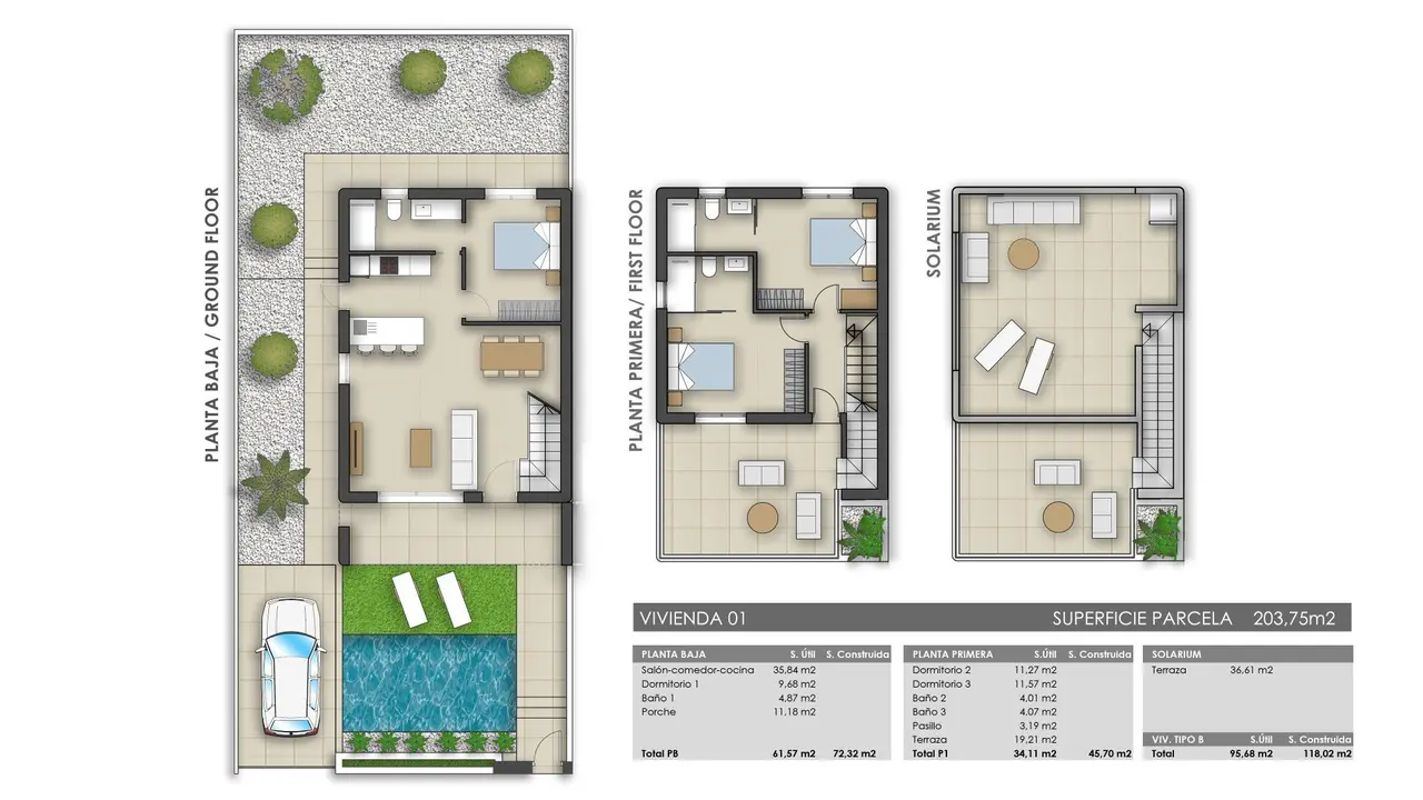Wnętrze willi składa się z 3 sypialni, 3 łazienek en suite, dużego otwartego salonu z kuchnią, wszystko znajduje się na dwóch piętrach.