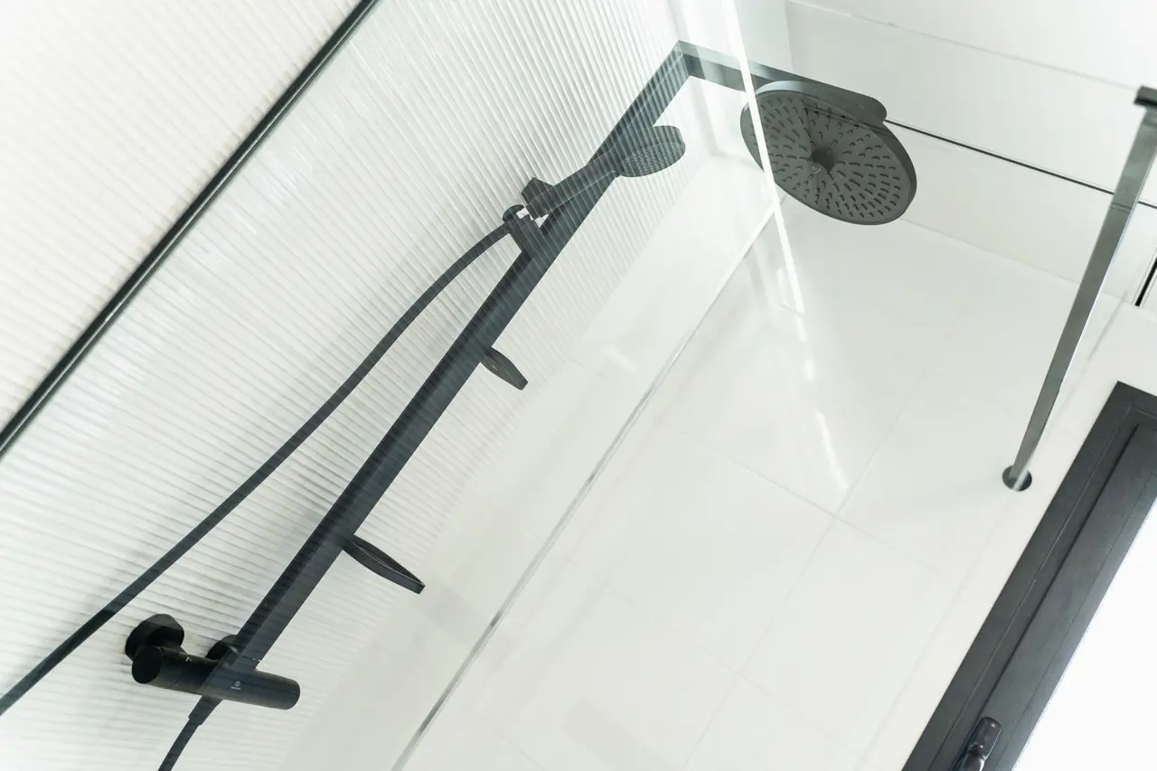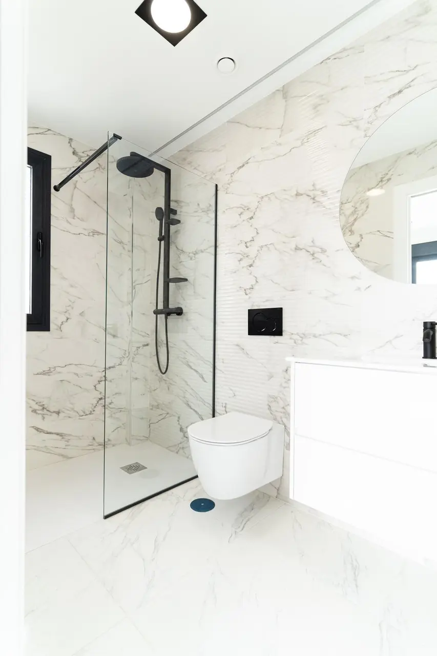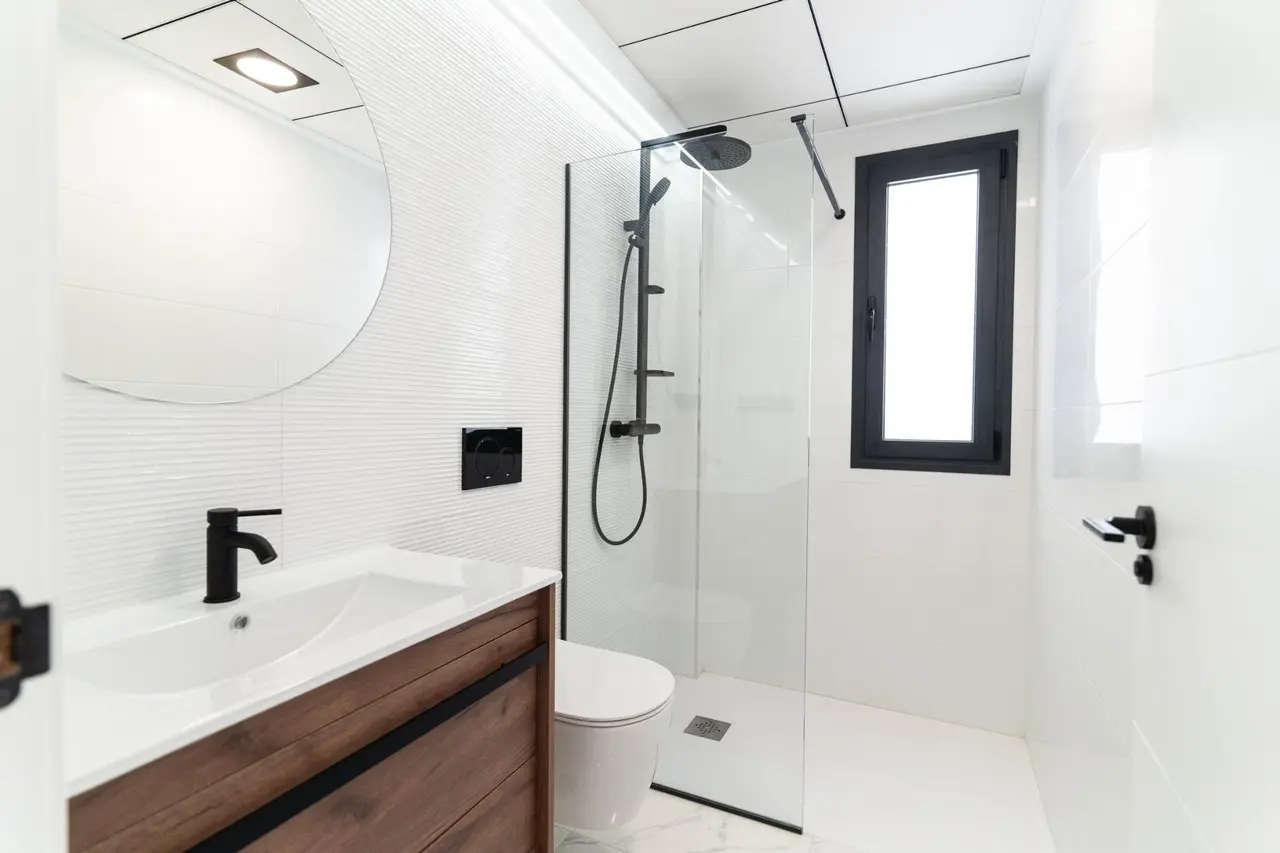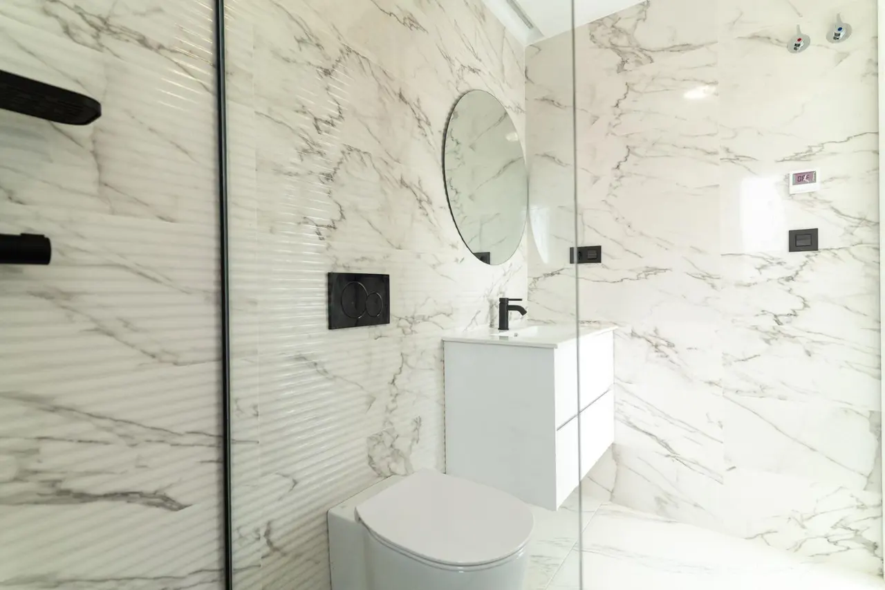 W pełni wyposażone łazienki z meblami i kabinami prysznicowymi.