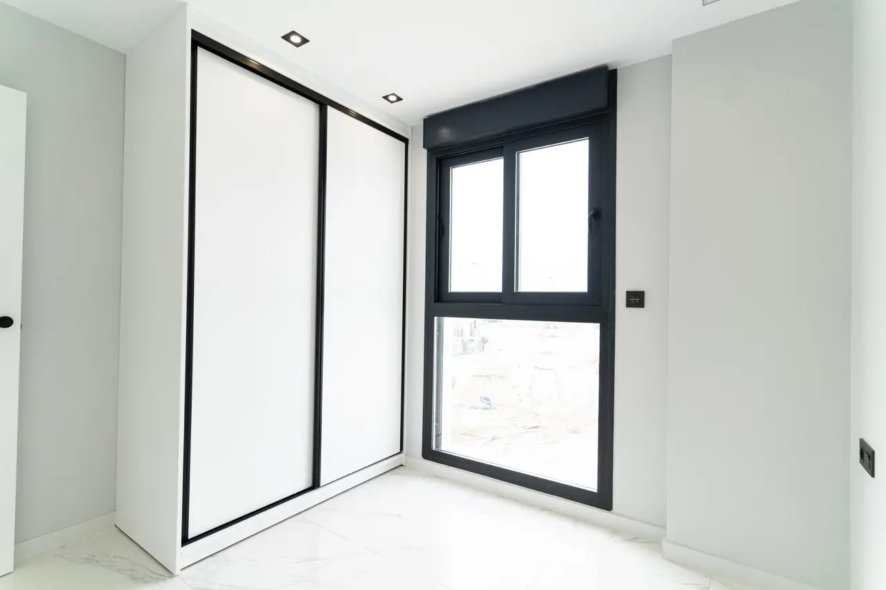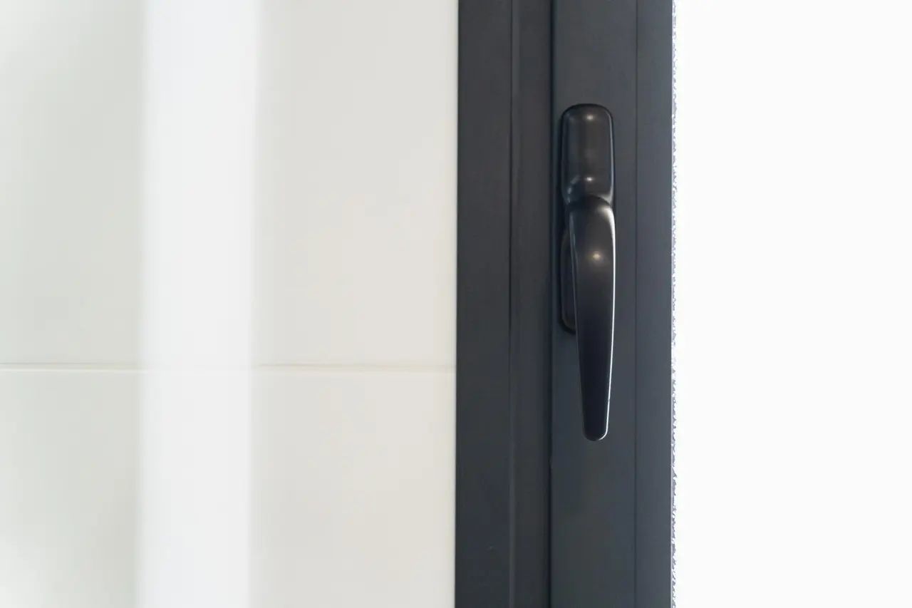 Aluminiowa stolarka zewnętrzna, podwójne szyby i aluminiowe okiennice.