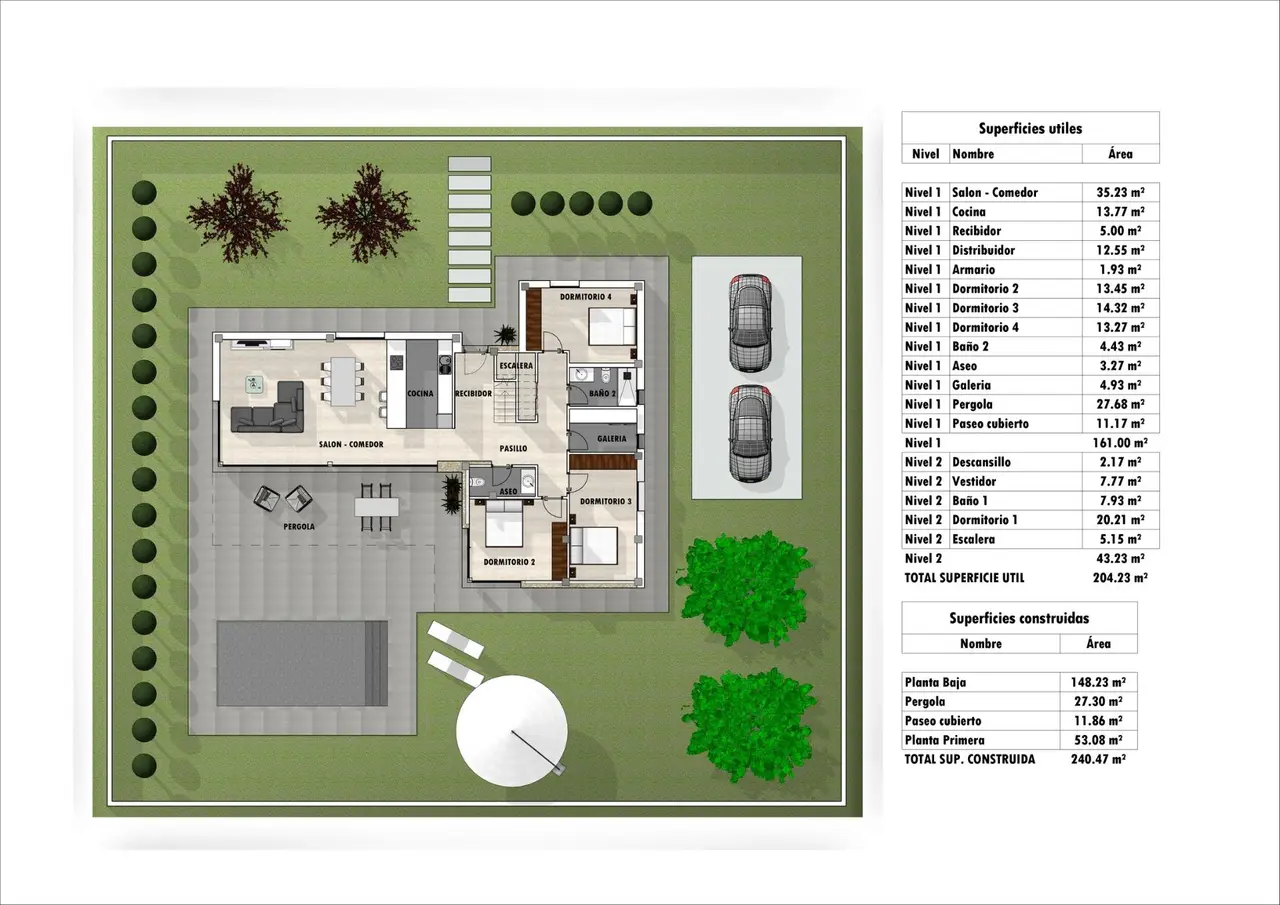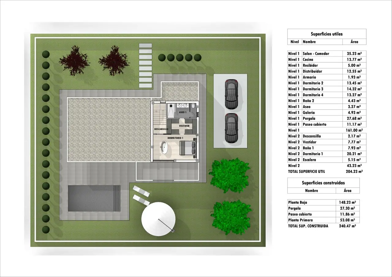 Wille zostaną zbudowane na rustykalnych działkach o powierzchni 10.959 m2, z których około 2.000 m2 zostanie ogrodzonych, z wszystkimi dostawami wody, energii elektrycznej, instalacją zestawu paneli fotowoltaicznych do samodzielnego zużycia energii elektrycznej i systemu oczyszczania ścieków za pomocą biologicznej oczyszczalni utleniającej.