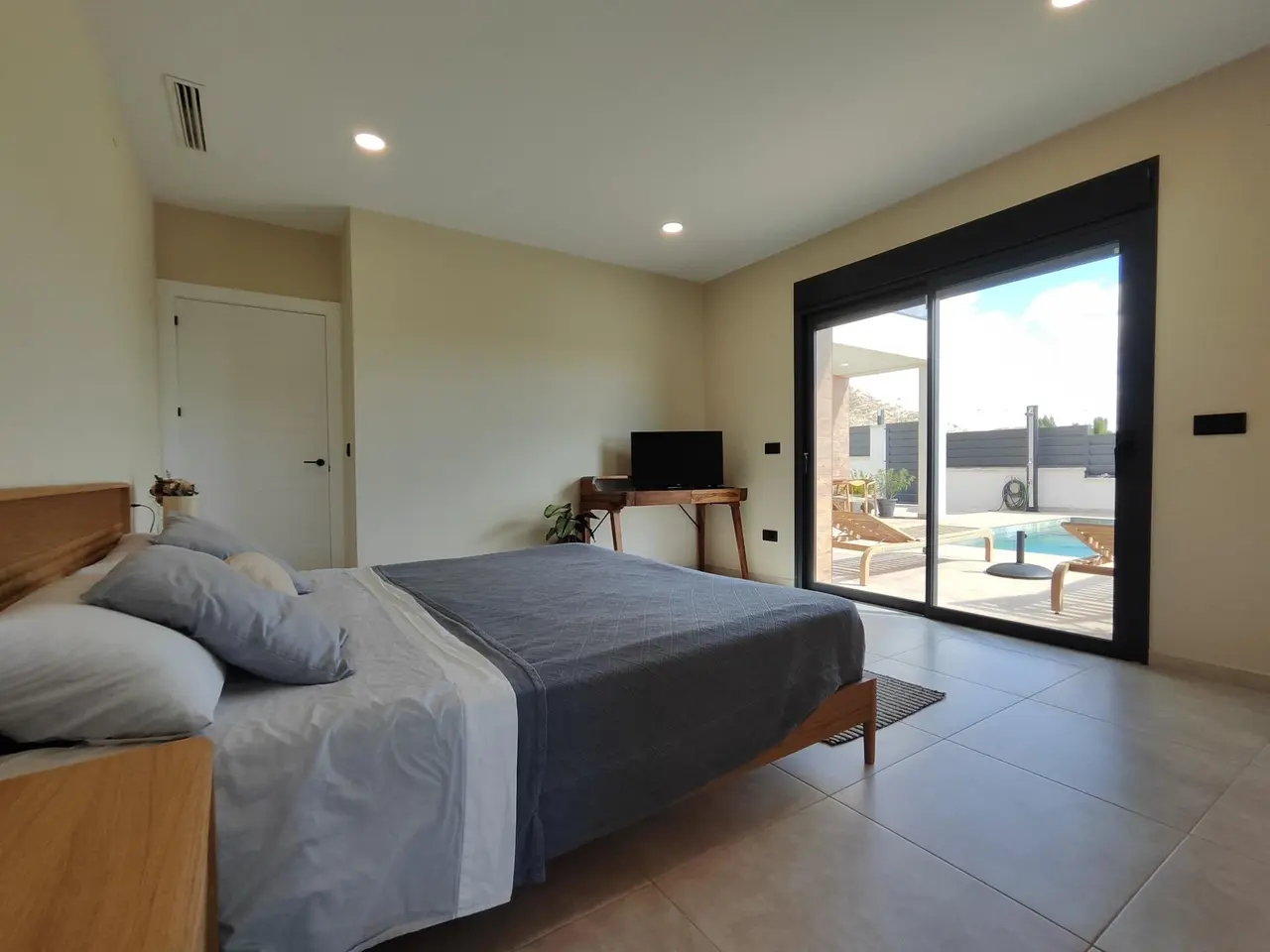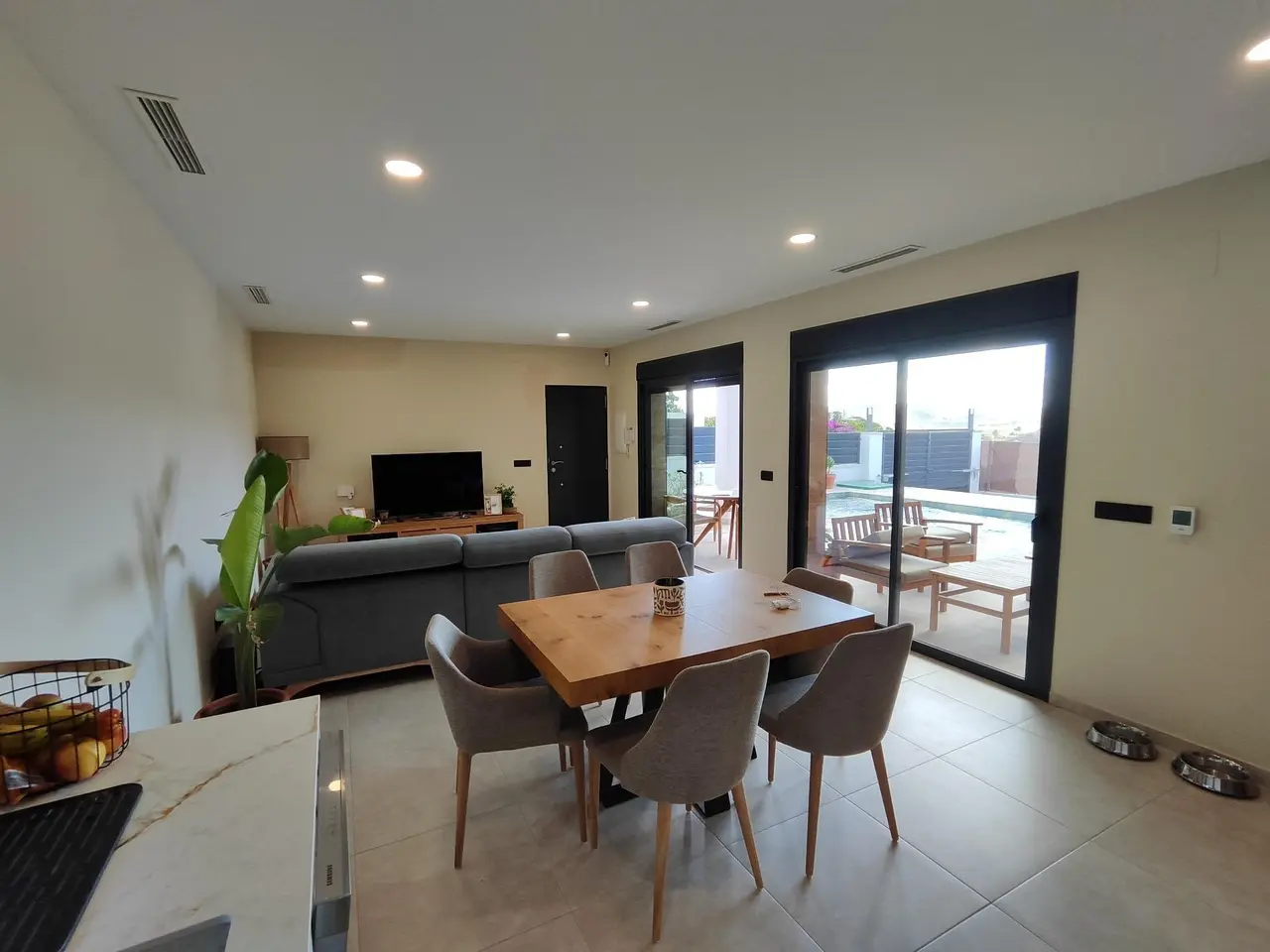 Dom posiada prywatny basen i fotowoltaiczne panele słoneczne do zasilania w energię elektryczną.