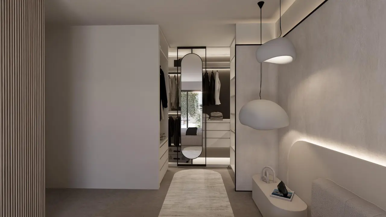 – Wbudowane szafy z przesuwanymi drzwiami w jasnym kolorze. Kompletne wykończenie wnętrz.
