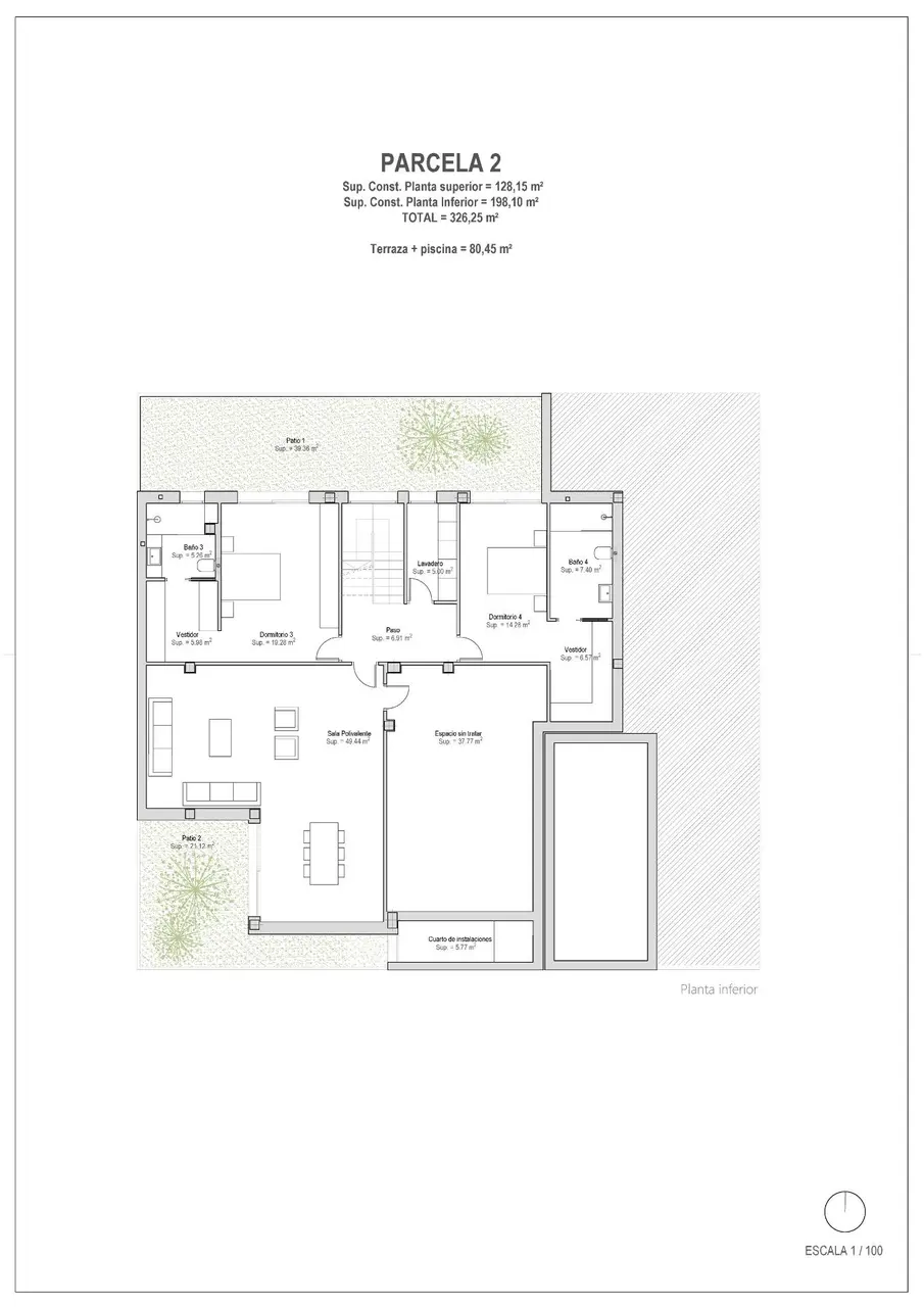 Willa jest rozmieszczona na 2 poziomach i ma 4 sypialnie, 4 łazienki, kuchnię na otwartym planie z jasnym salonem, który zapewnia dostęp do ogrodu z basenem i parkingiem, dużą piwnicę z angielskim patio i 76m2 powierzchni wielofunkcyjnej, idealnej na pokój zabaw, kino domowe, siłownię lub inne potrzeby rodzinne.