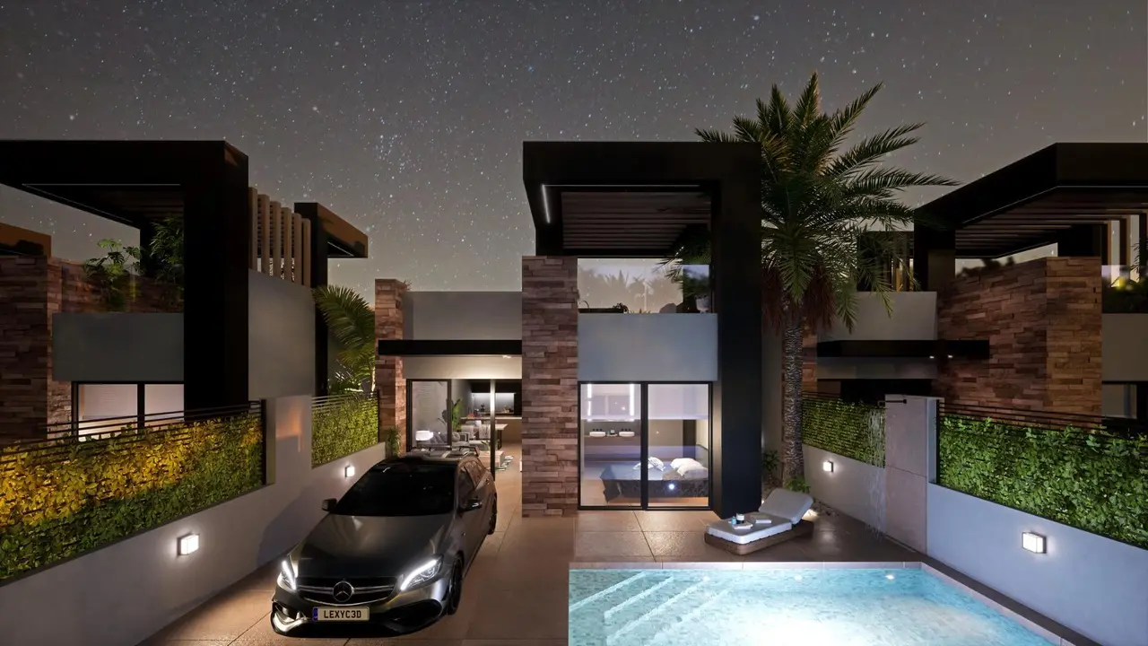 Nowoczesne wille mają 3 sypialnie, 2 łazienki, otwarty salon i kuchnię na jednym poziomie.