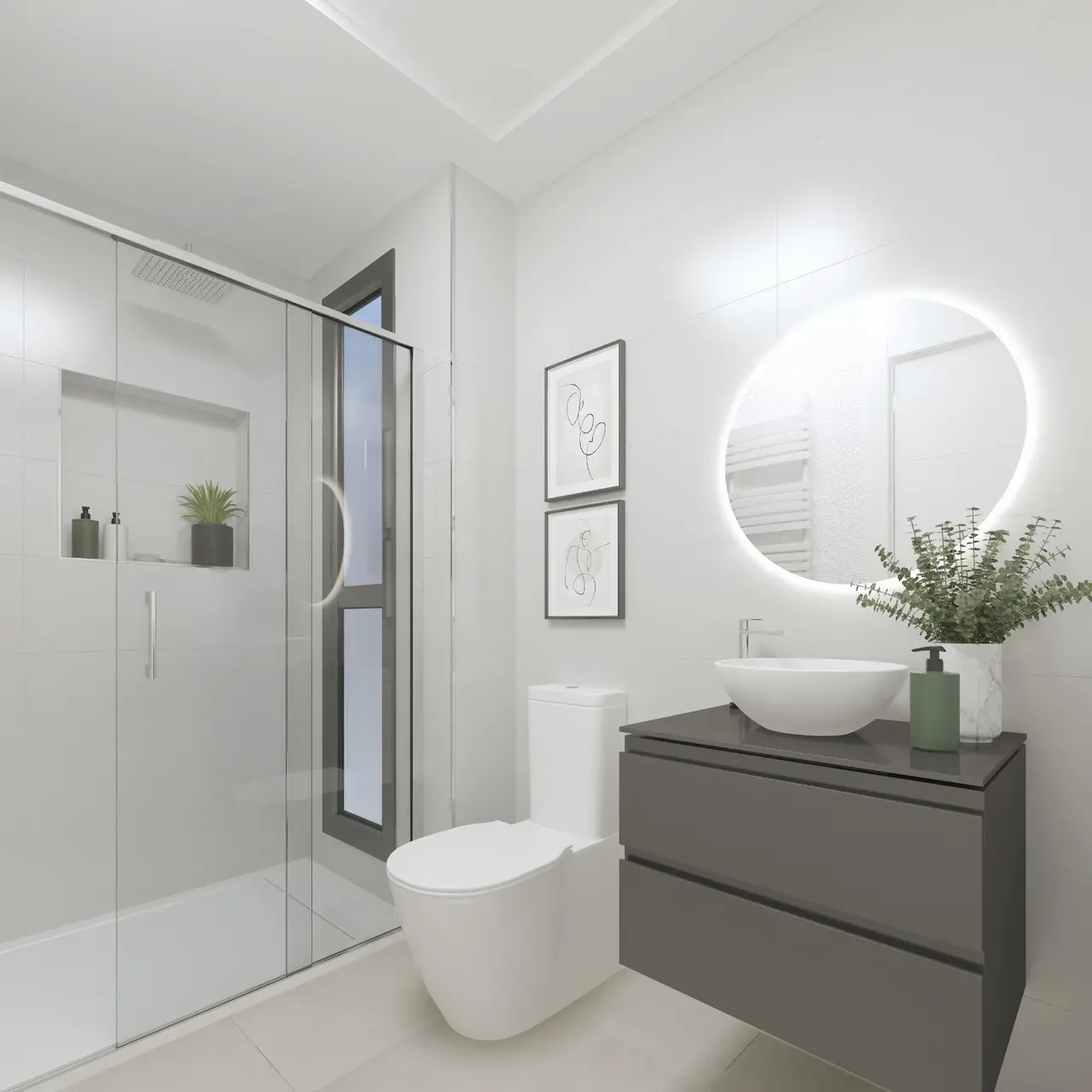 W pełni wyposażone łazienki z podwieszaną wanną, toaletą, lustrem, prysznicem i parawanami prysznicowymi.