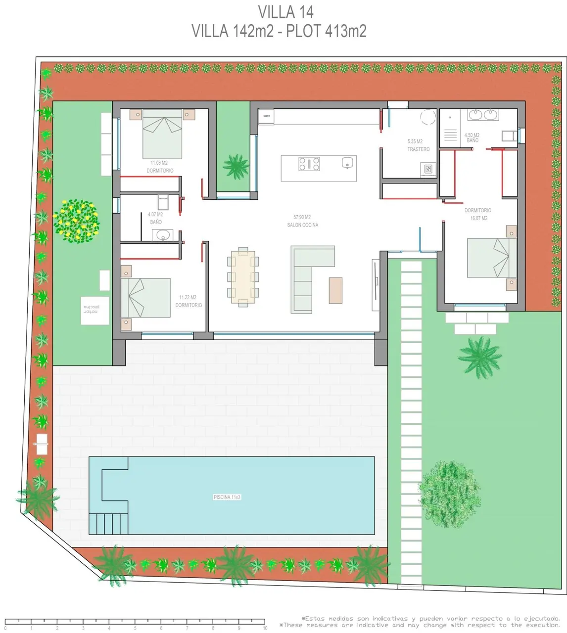 Wille zbudowane na 1 piętrze i składa się z 3 sypialni, 2 łazienki, kuchnia na otwartym planie, salon z otwartym widokiem na taras, prywatny ogród z basenem.