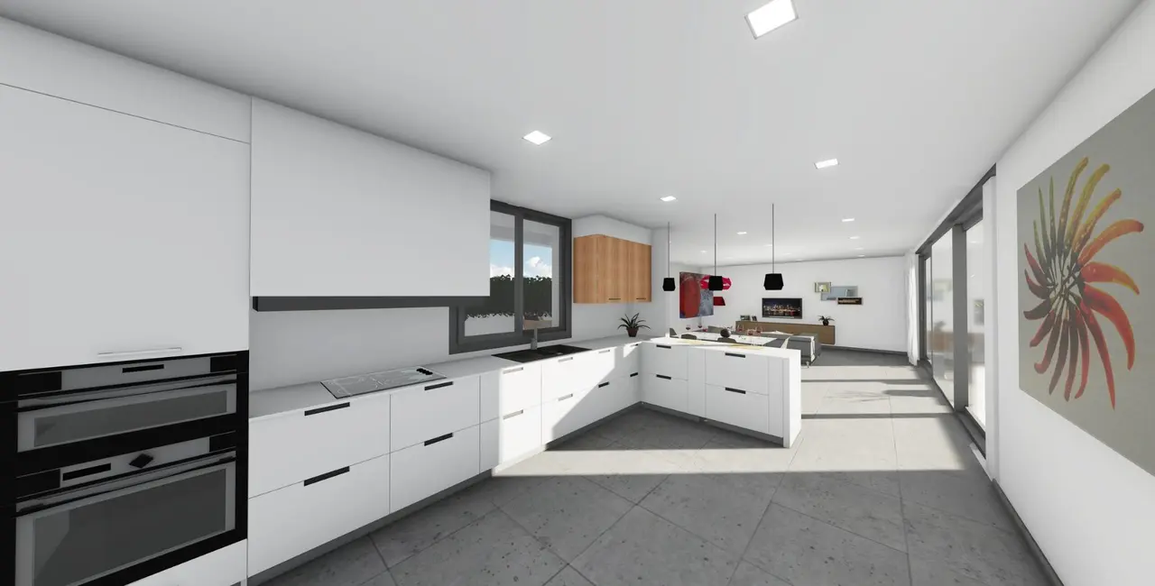 Kuchnia w zabudowie z blatem i frontami Silestone, sprzęt AGD (pralka, piekarnik, płyta ceramiczna, okap, zmywarka, lodówka i termowentylator).