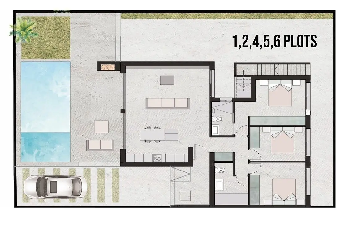 3 sypialnie (główna sypialnia en-suite) i oddzielna łazienka rodzinna … zaprojektowane we współczesnym stylu „eko” i otwartej koncepcji planu, składającej się z wyposażonej kuchni i salonu-jadalni, prywatnego letniego patio.