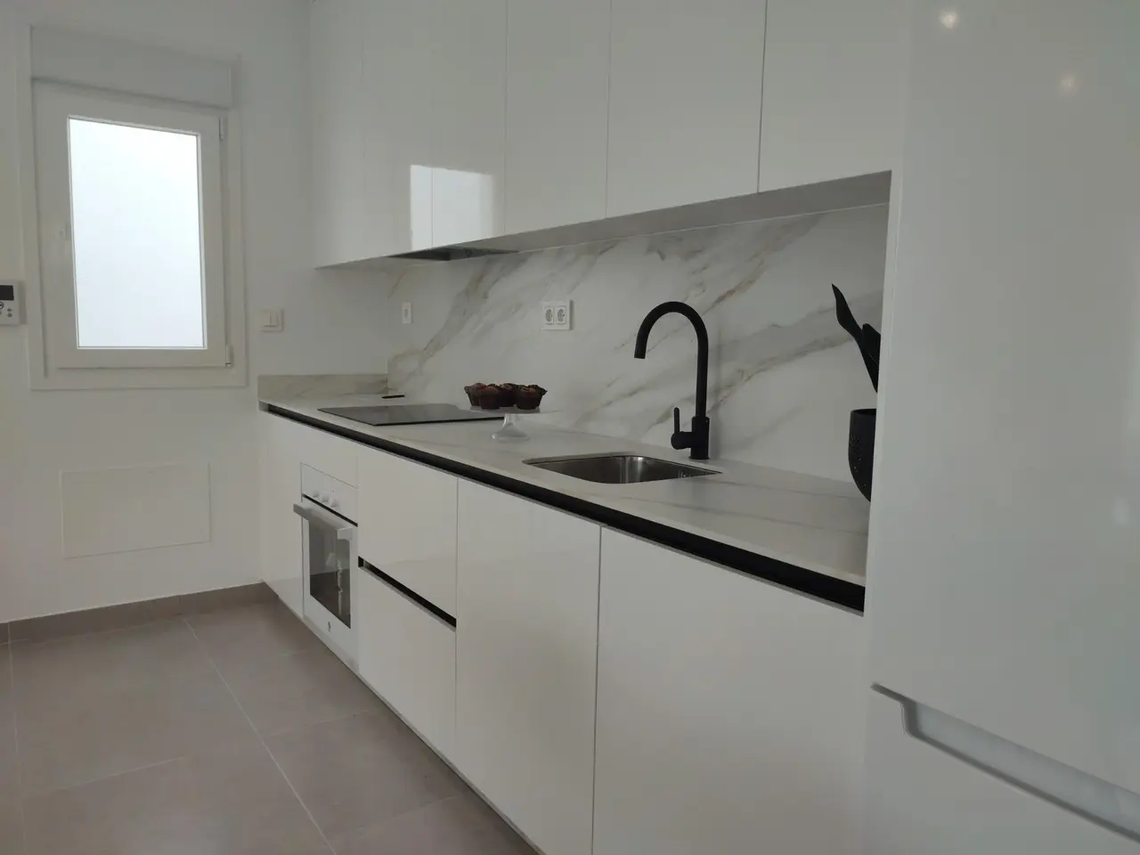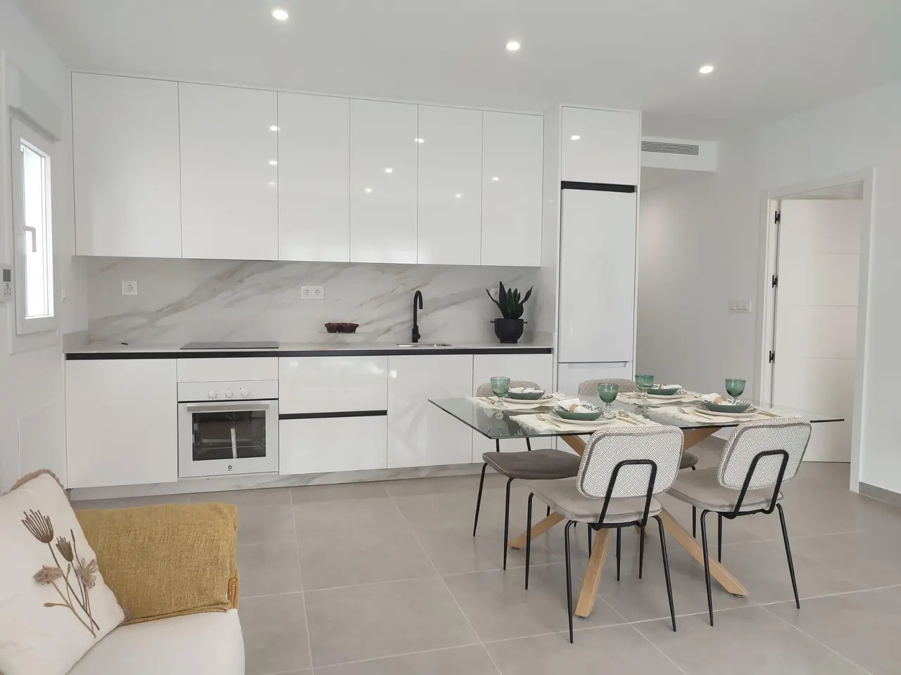 Kuchnia całkowicie umeblowana i wyposażona w piekarnik, zintegrowaną lodówkę i zmywarkę, płytę grzewczą i wentylator wyciągowy. Strefa robocza w postaci wyspy kuchennej.