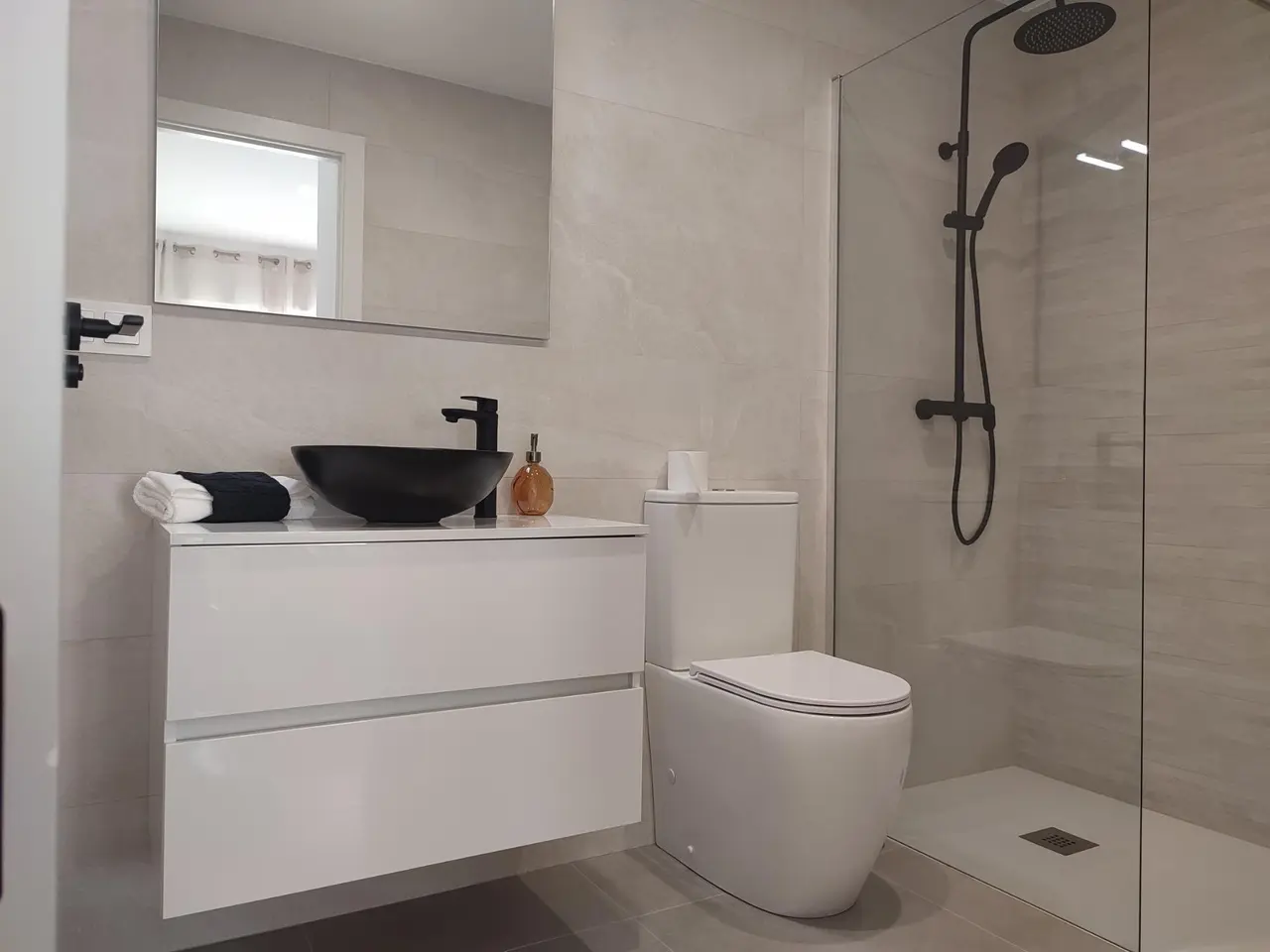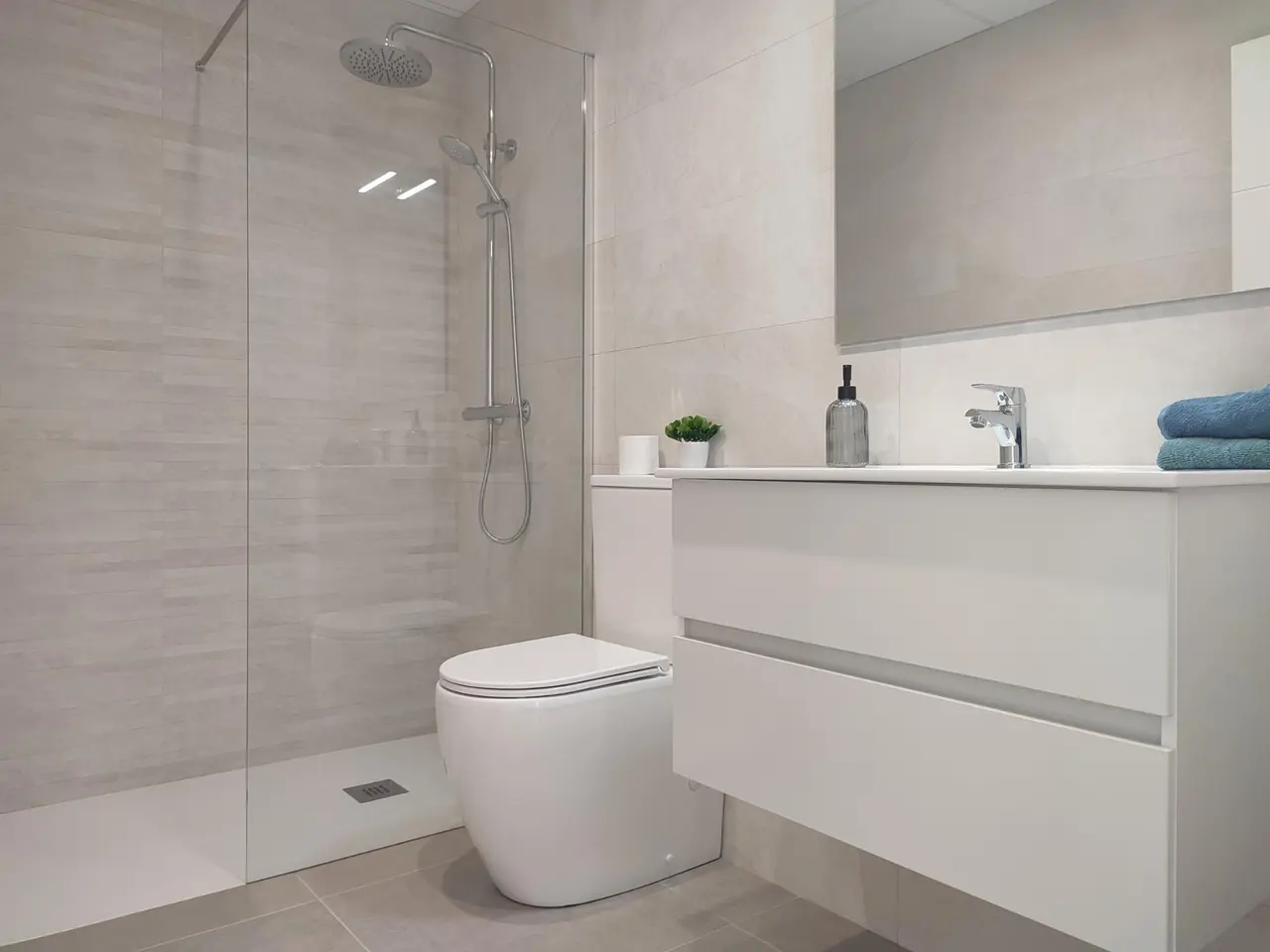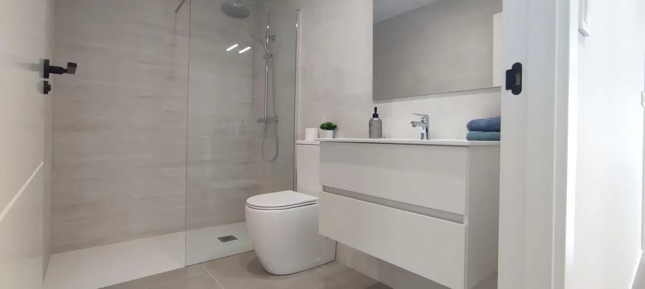 W pełni wyposażone łazienki z toaletą, szafką, lustrem i prysznicem z parawanem.