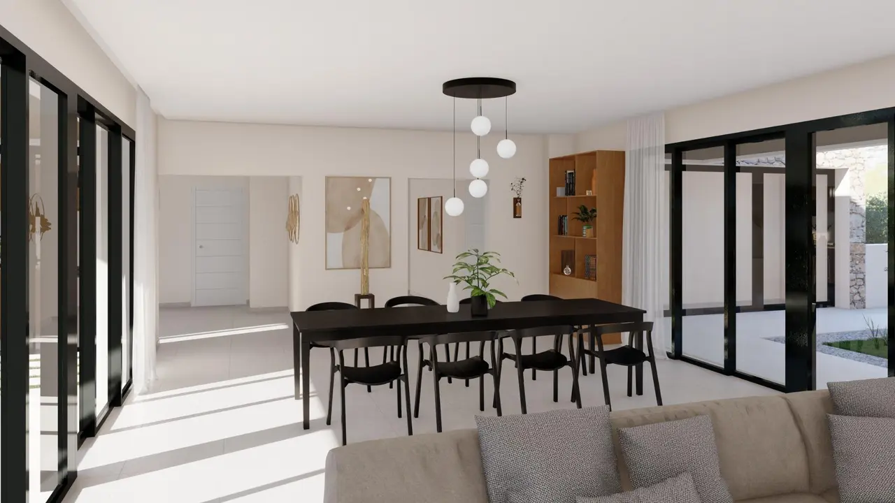 Strefa dzienna ma otwarty projekt, łącząc kuchnię, jadalnię i salon w dużej przestrzeni z dużymi oknami, które dają dostęp do obszaru zewnętrznego z dużymi tarasami, ogrodem i prywatnym basenem.