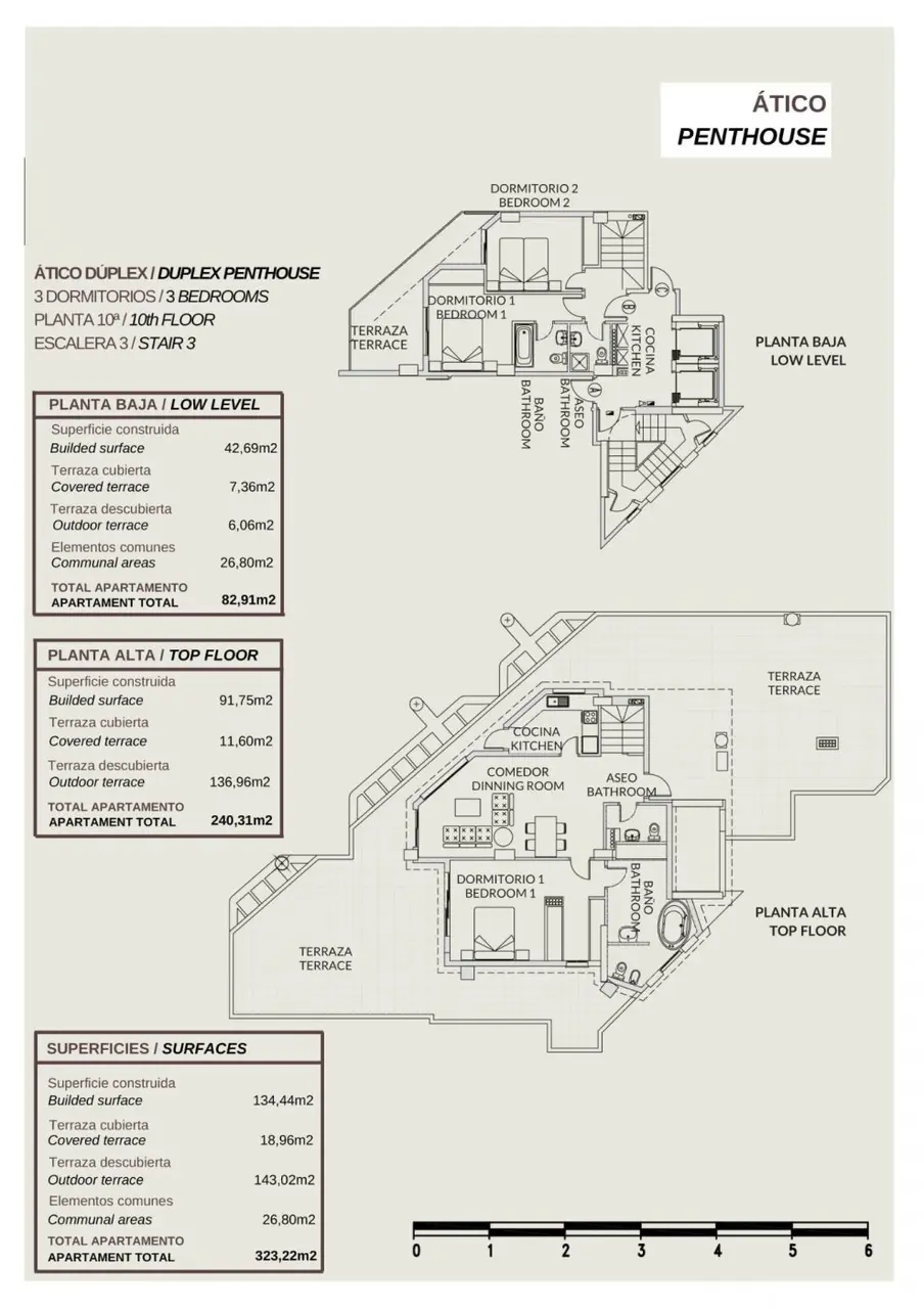 2-piętrowy penthouse z 3 sypialniami, 2 łazienkami i tarasami, z których roztaczają się wspaniałe widoki na morze.