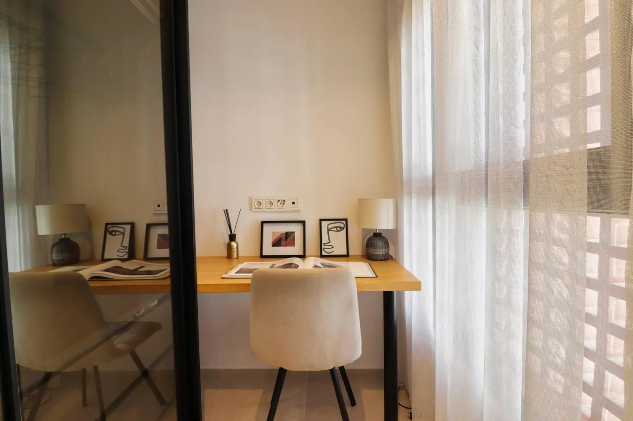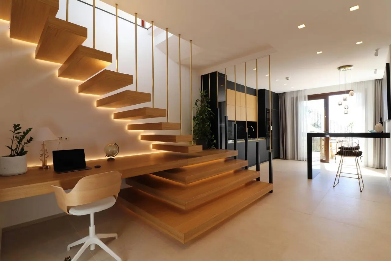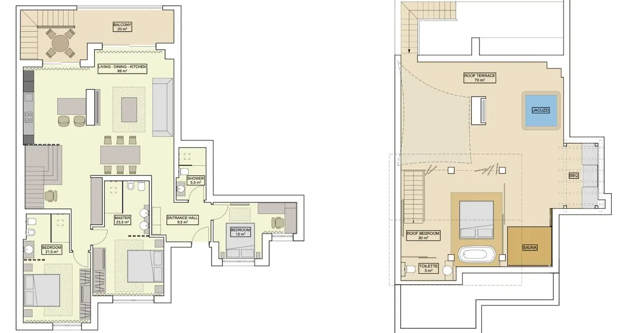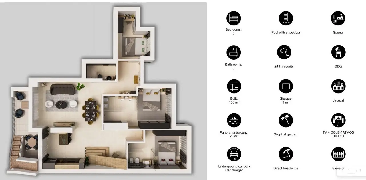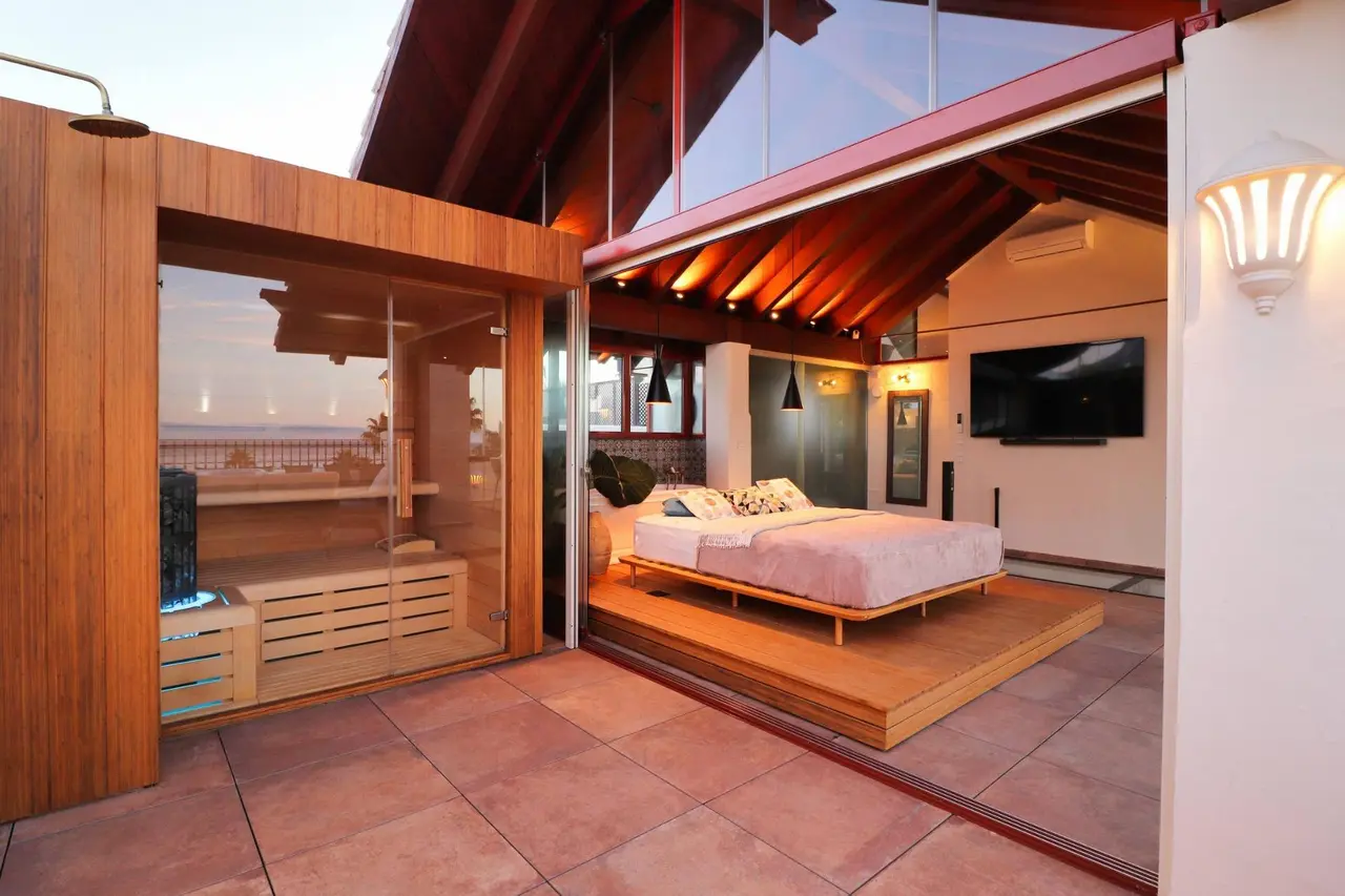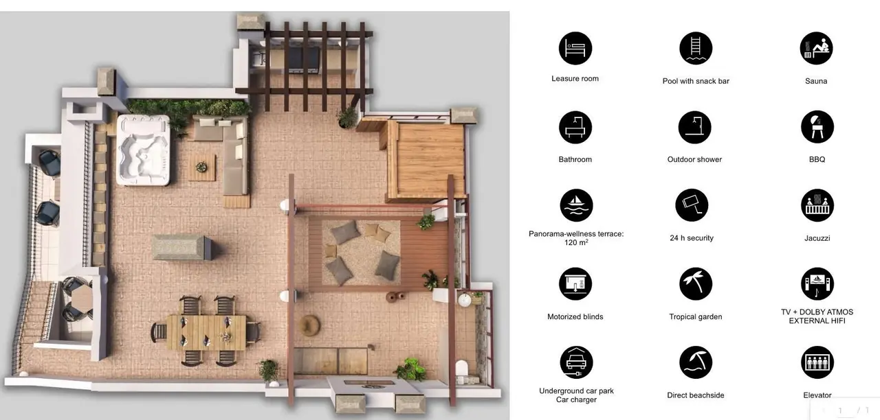 Ten dwupoziomowy penthouse łączy w sobie nowoczesną elegancję architektoniczną z akcentami andaluzyjskiego i północnoafrykańskiego designu na tarasie na dachu. Główny poziom apartamentu obejmuje: