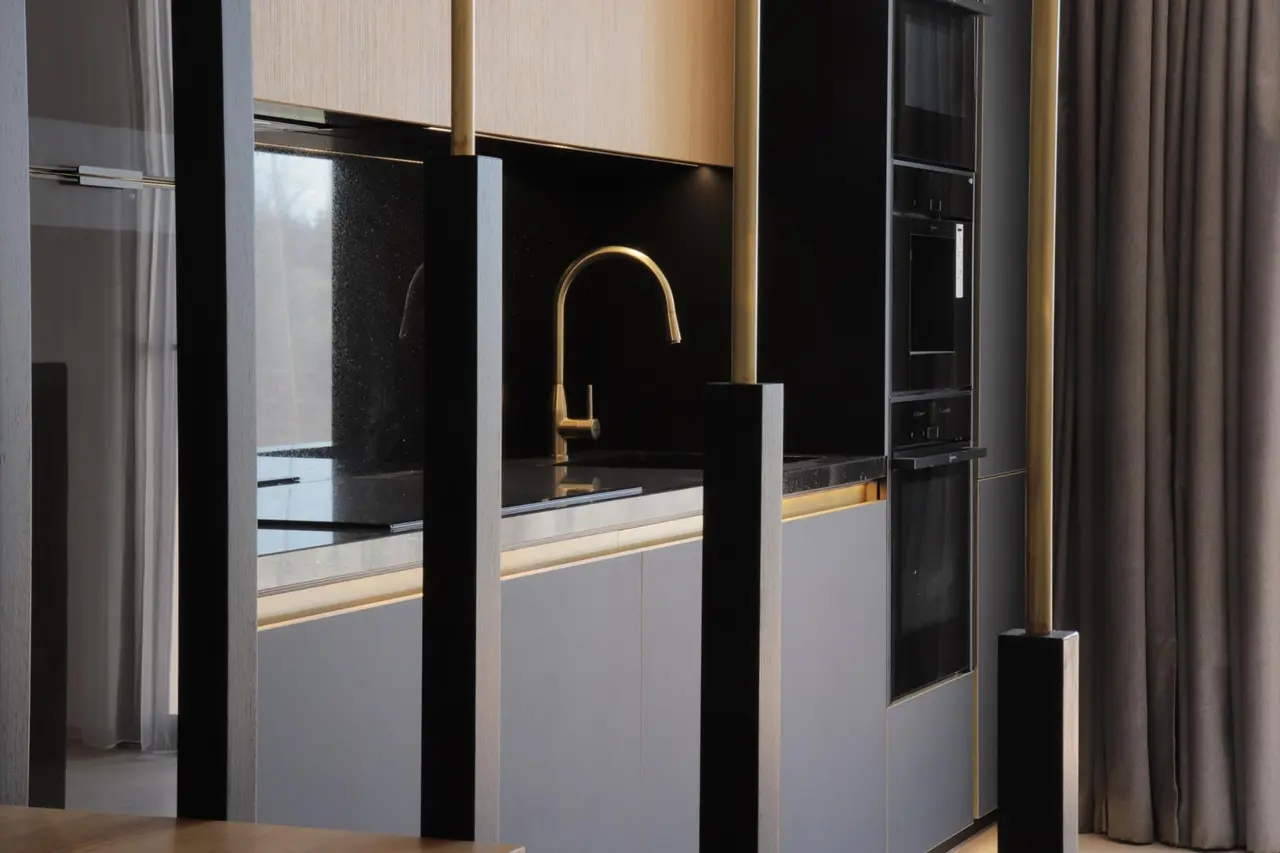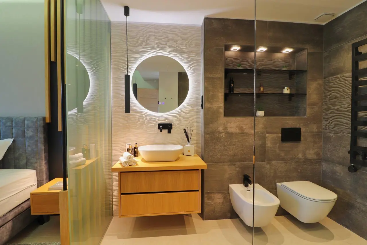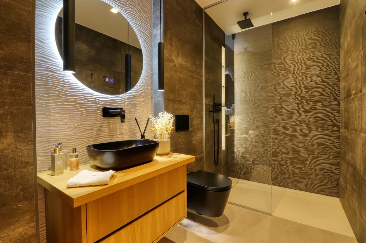 Trzy sypialnie: Każda z własną łazienką i unikalnymi motywami dekoracyjnymi (Guest, Golden, Black).