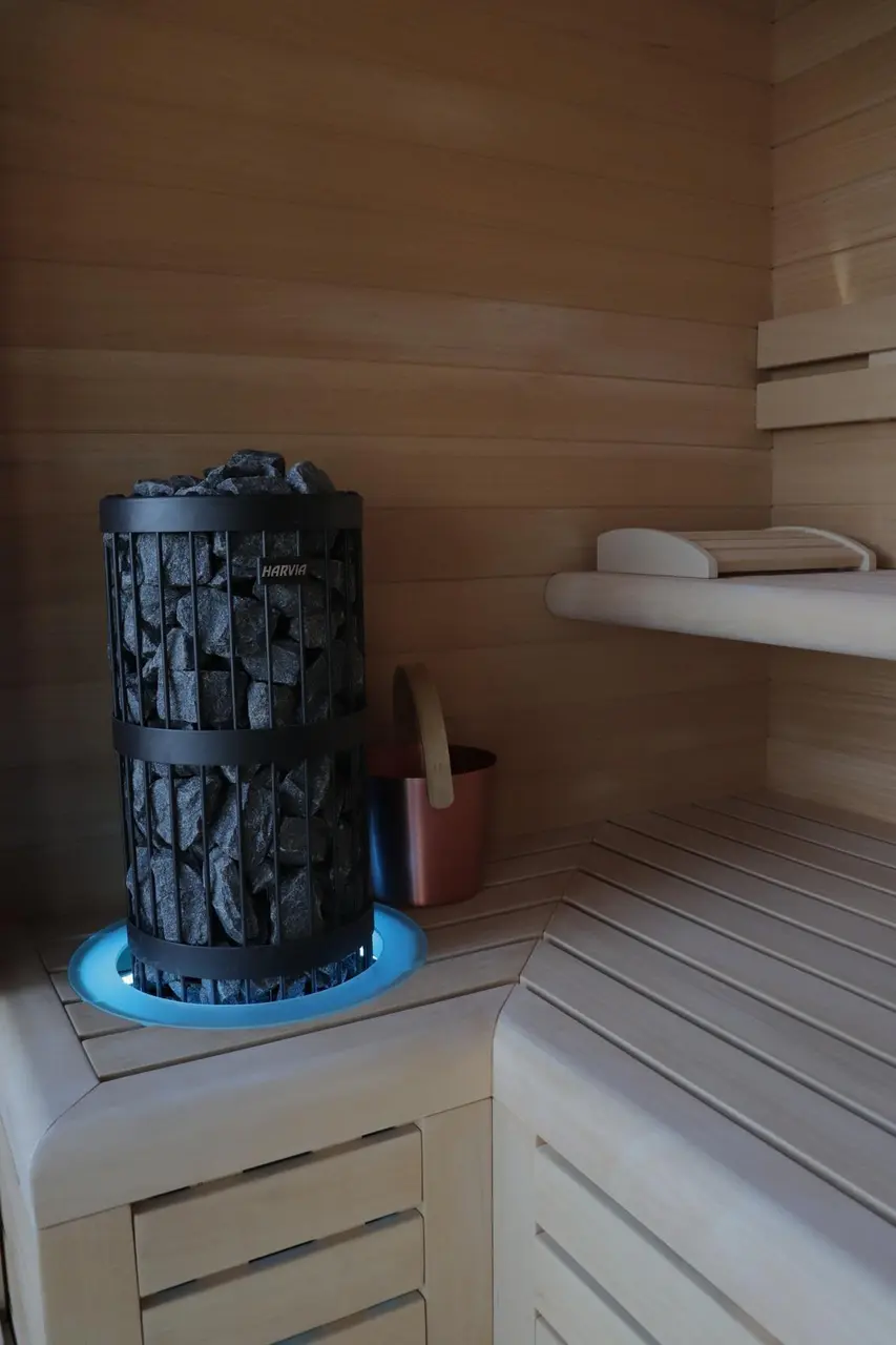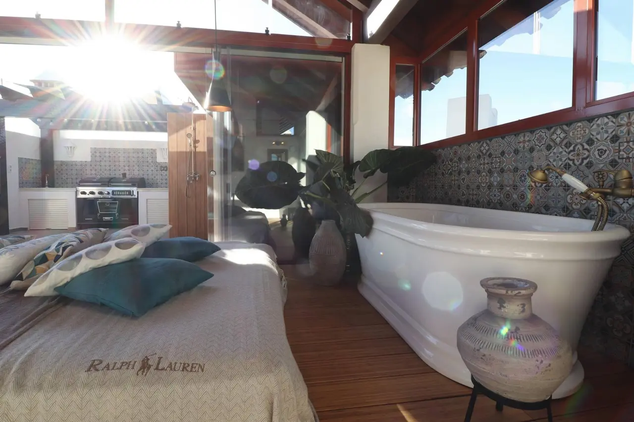 Taras wellness na dachu to prawdziwa oaza z jacuzzi, sauną i miejscem do grillowania. W pełni przeszklona przestrzeń rekreacyjna, wraz z prywatną łazienką, oferuje całoroczną przyjemność pod pięknie wykonaną drewnianą konstrukcją.