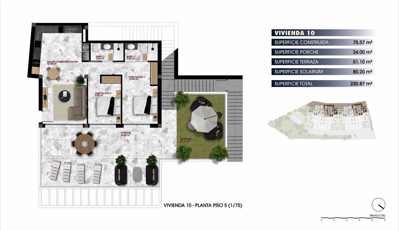 Kompleks nowoczesnych apartamentów i penthouse’ów z 2 sypialniami, 2 łazienkami, kuchnią na otwartym planie z salonem i jadalnią oraz tarasami.