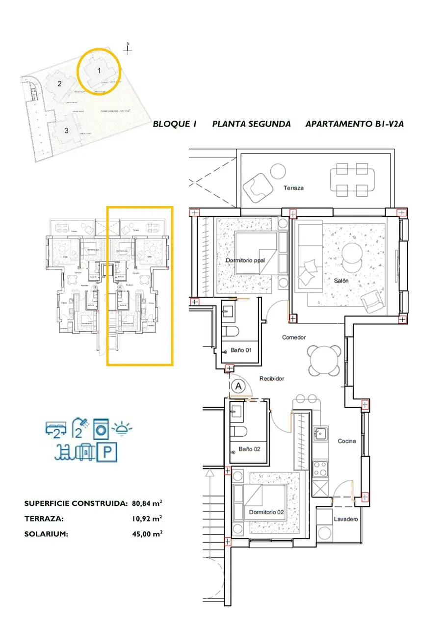 Kompleks składa się z 3 bloków mieszkalnych, wszystkie mają 2 sypialnie, otwartą kuchnię i salon, wyposażone szafy, miejsce parkingowe.